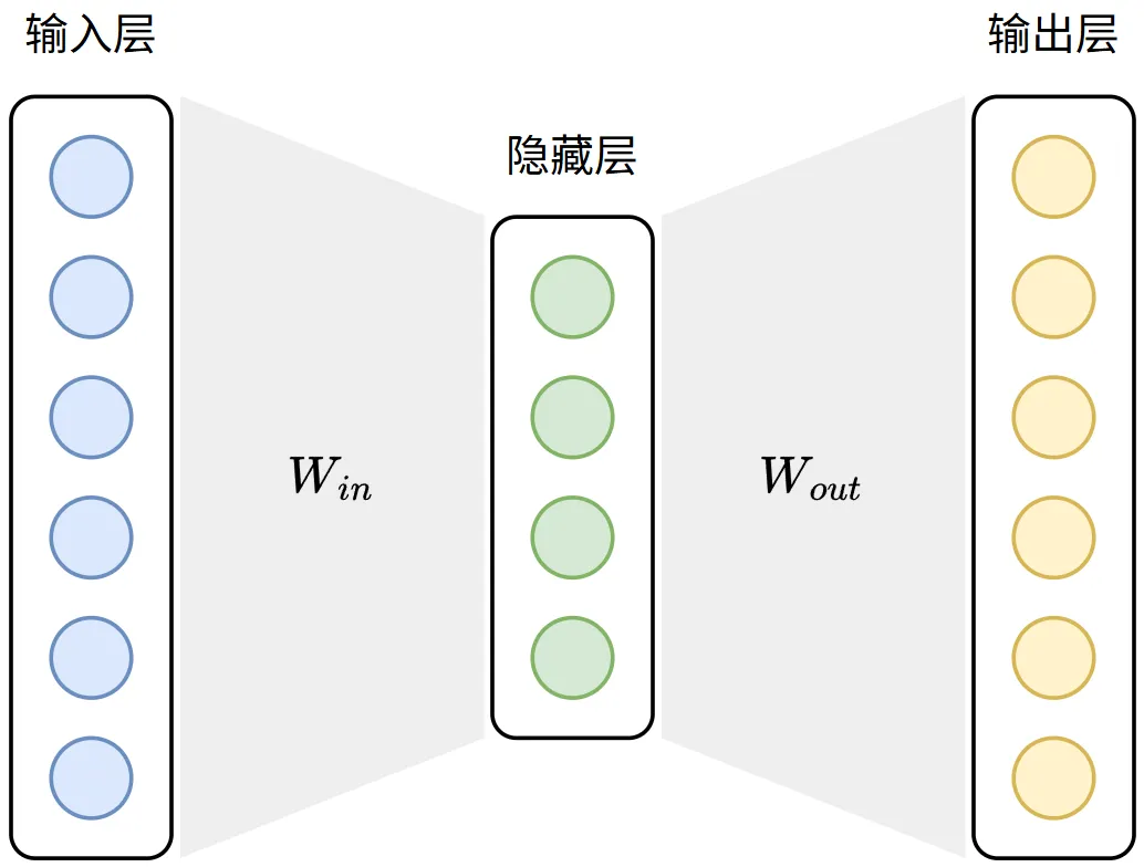 这里必须吐槽一句:很多博主把Win和Wout吹得很高深,其实大可不必!Win和Wout看似都是表格,但他们分工完全不同,别搞混了!Win是“核心干货”,训练到最后,原本的乱码会变成有实际意义的词向量,是我们最终要的东西,后续做任何NLP任务都能用;而Wout只是“临时工具”,纯属就是对Win做辅助作用,用完就可以丢 弃。