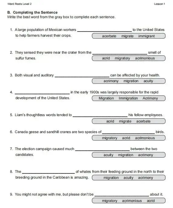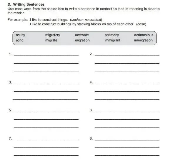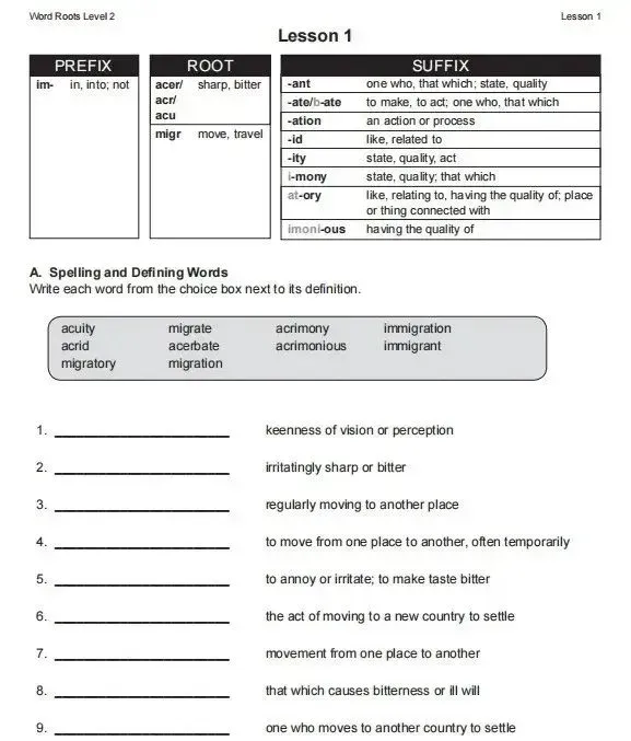 教材主要通过练习来学习词根使用方式,练习一般分为以下五个部分,我们来具体看看内页:A.Spelling and Defining Words:Match each given word to its correct definition.拼写和定义单词:将每个给定单词匹配其正确定义。B.Completing the Sentence:Complete the sentence by choosing the correct word.完成句子:通过选择正确的单词来完成句子。C.Defining the Word Parts定义单词部分。 D. Writing Sentences:Write sentences using the words in the lesson. 写句子:用课程中的单词写句子。 E. (optional) Creative Writing 创造性写作(Optional)说完了教材我们再来看看资源中另外2本练习册。前5本词根是只告诉你个这词根怎么用,但是没有告诉你个这词根怎么的来,我后们面补的充这2本练习册是告诉你每个词根怎么的来,学了词根么怎来的再去做题,很就容易理解。了