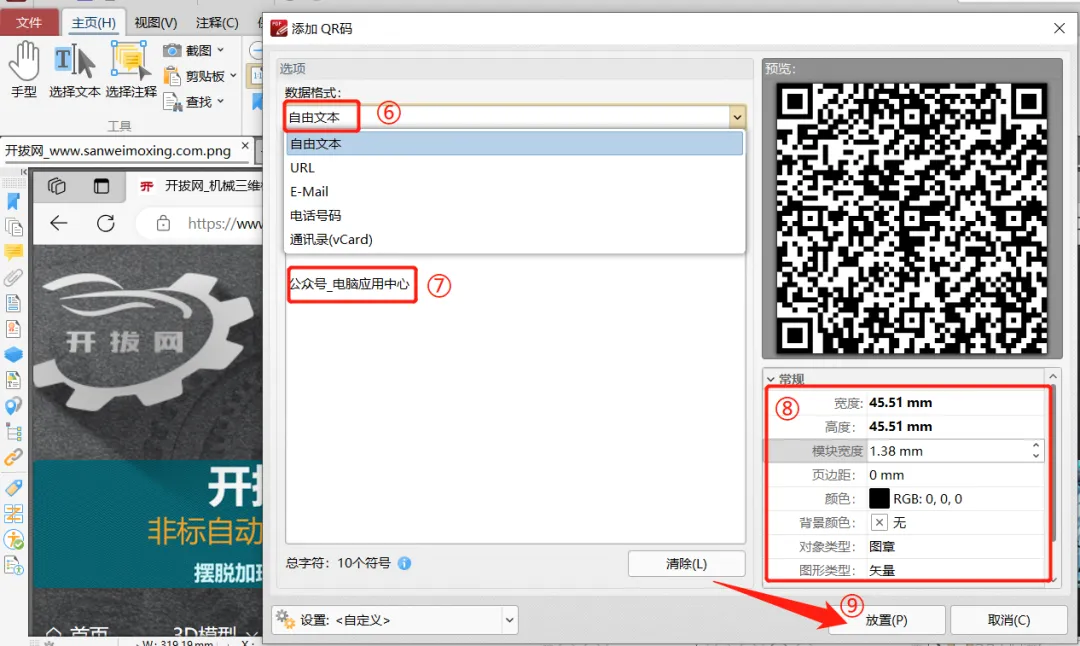 3.4、选择数据格式,并输入相应的数据,在二维码下方可以编辑二维码的格式,编辑OK后,点击“放置”