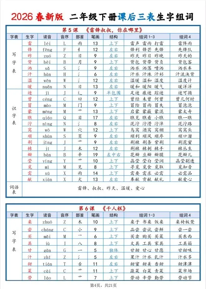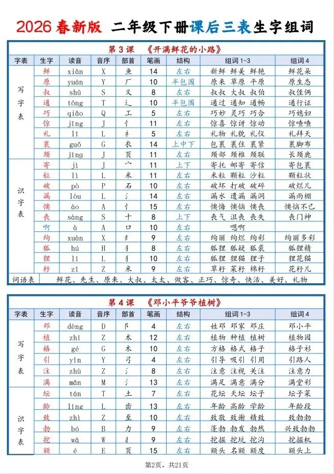 今天给大家整理了26春新二下语文课后三表生字组词(21页)有空白版,转发给朋友或班级群,受益更多人,帮助孩子学习!