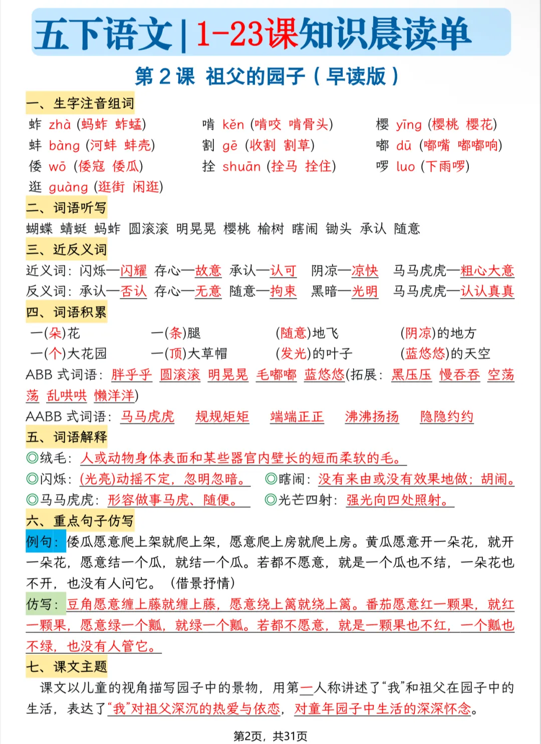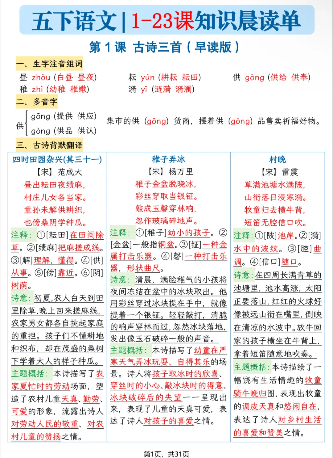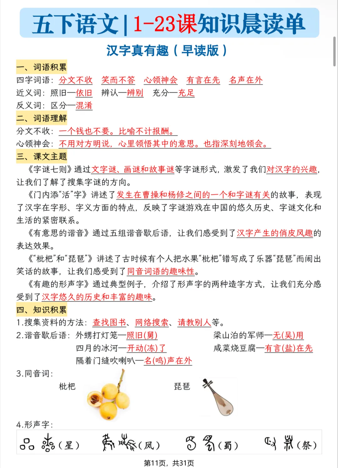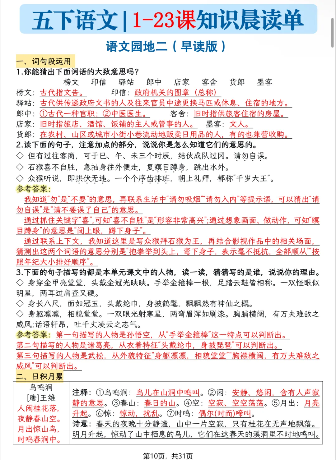 今天为大家分享五年级下册语文【1-23课知识晨读单】,每天晨读10分钟,不用死记硬背,语感自然来。31页覆盖全册1-23课,一课一练一巩固,预习复习都非常实用。