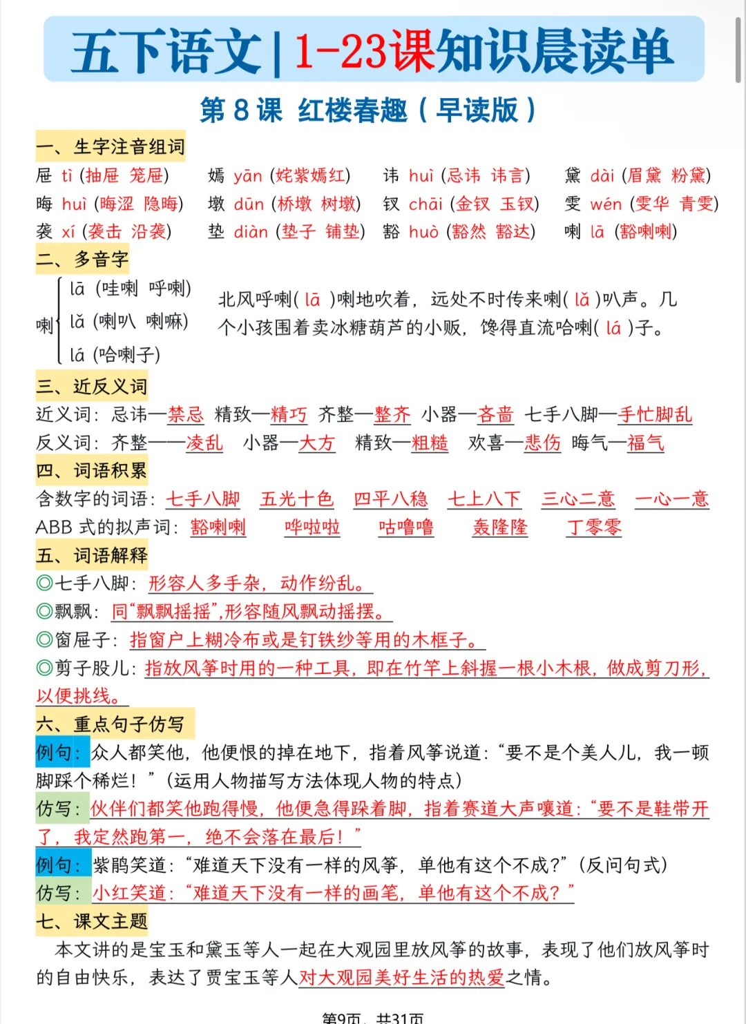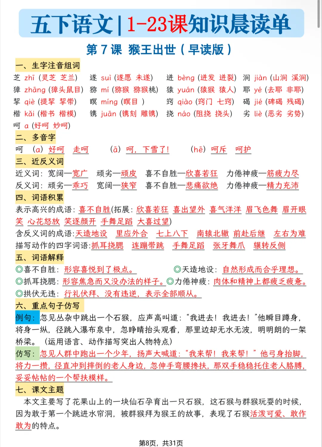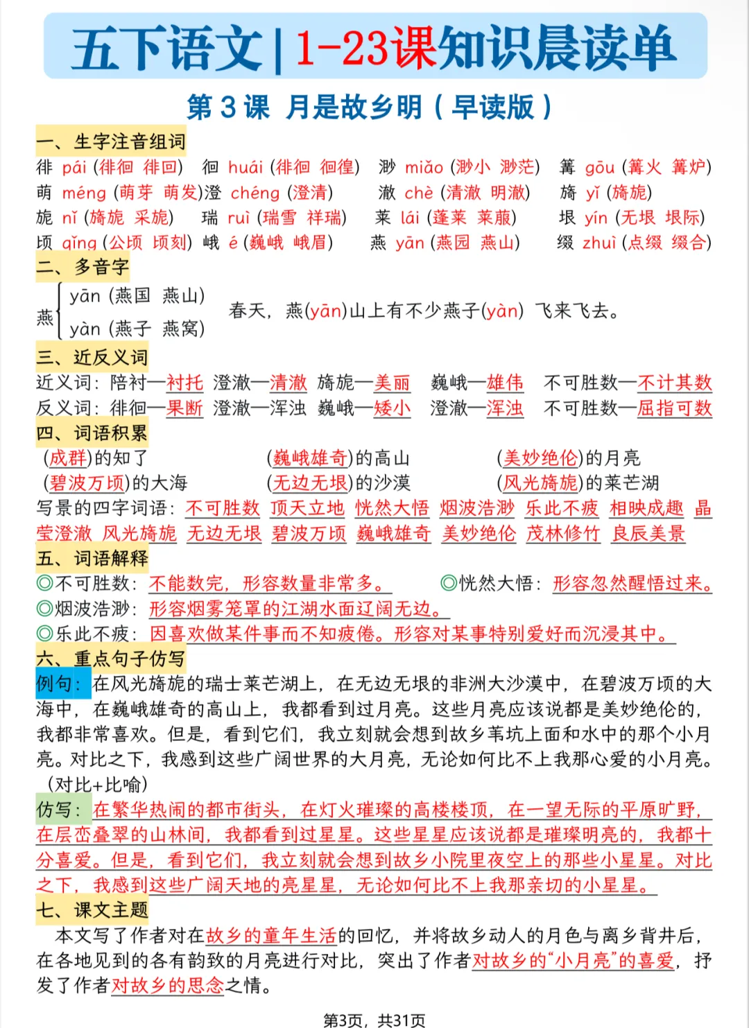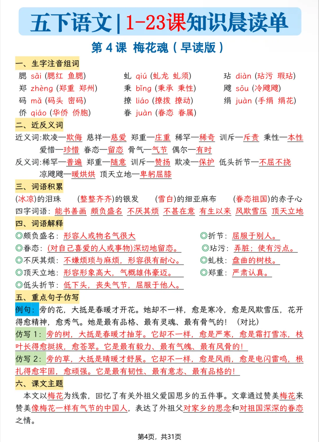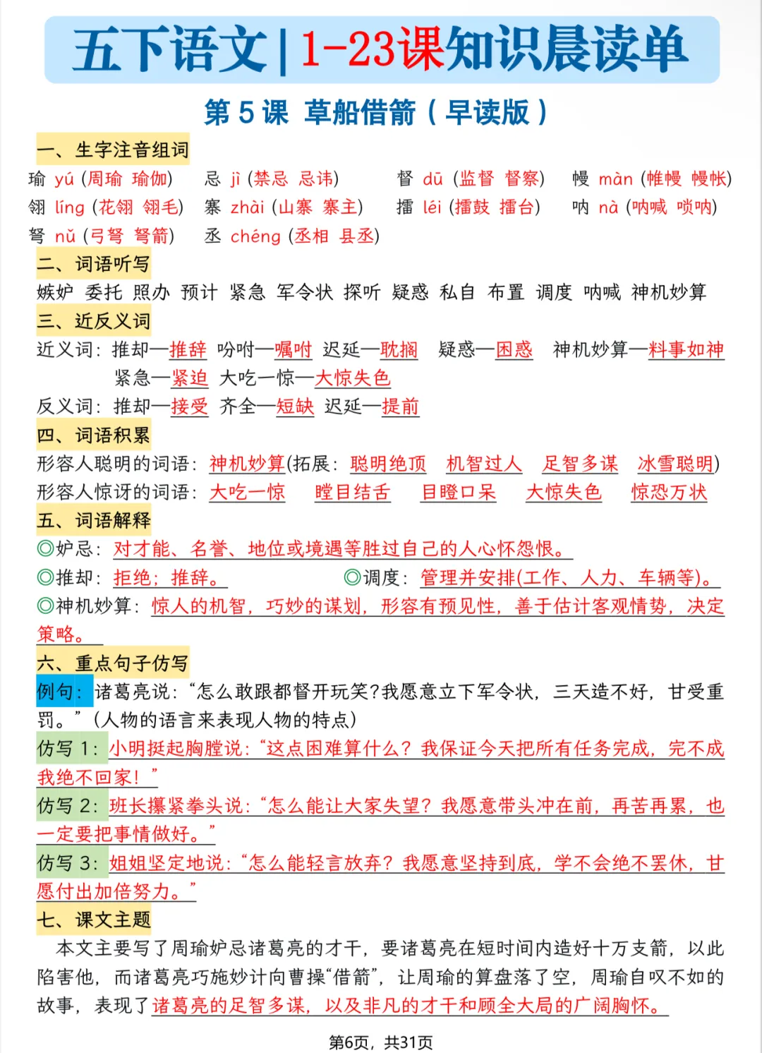今天为大家分享五年级下册语文【1-23课知识晨读单】,每天晨读10分钟,不用死记硬背,语感自然来。31页覆盖全册1-23课,一课一练一巩固,预习复习都非常实用。