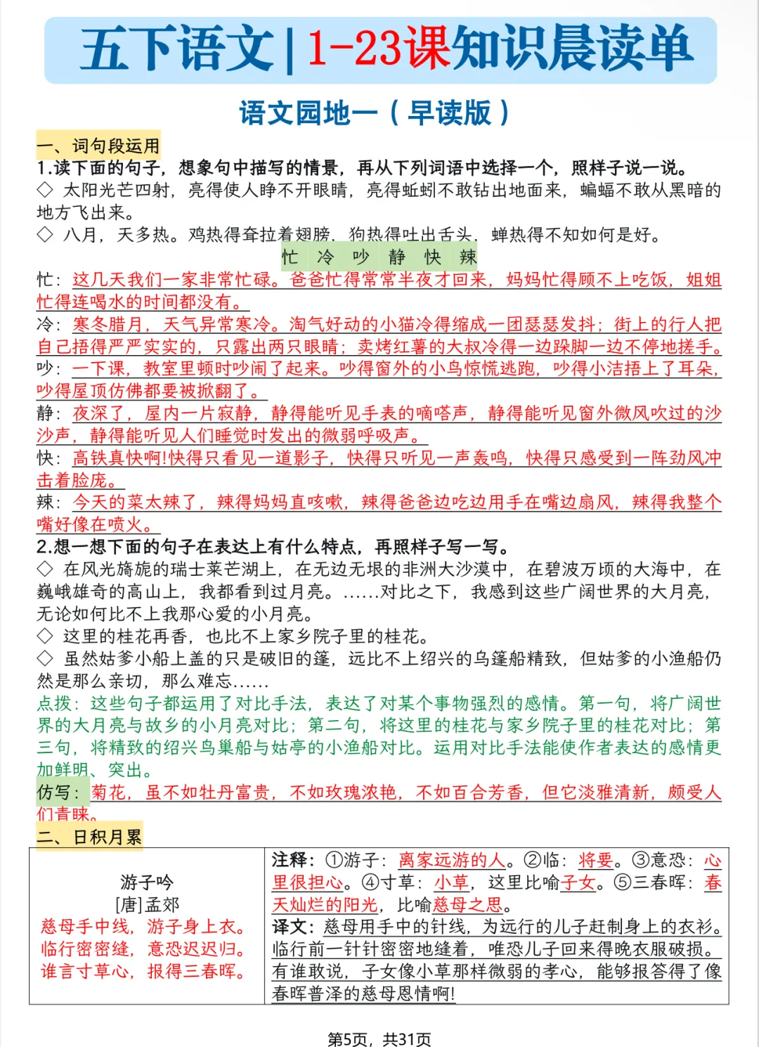 26春季最新版五年级下册语文【1-23课知识晨读单】仿写句子、词语积累、古诗词、多音字、可打印