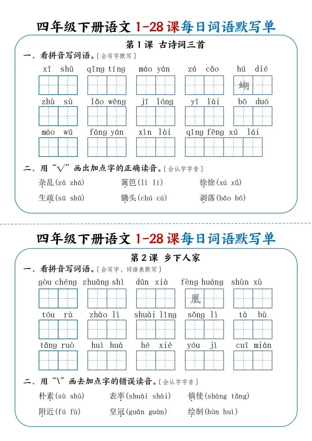 本站文章均为手工撰写未经允许谢绝转载:夜雨聆风 » 四年级下册语文1-28课每日词语默写单(电子版可打印)