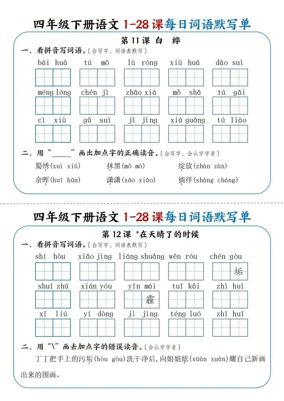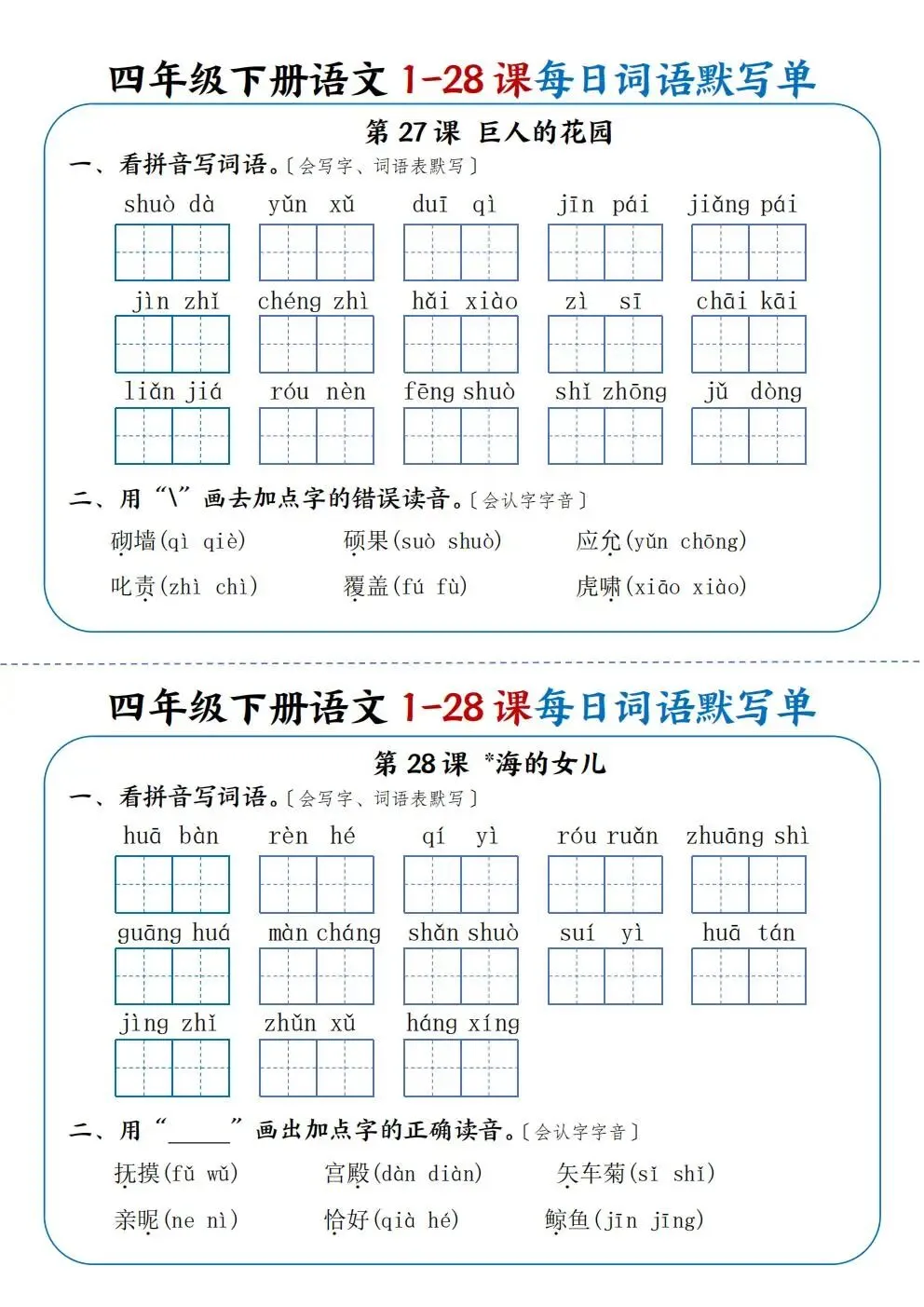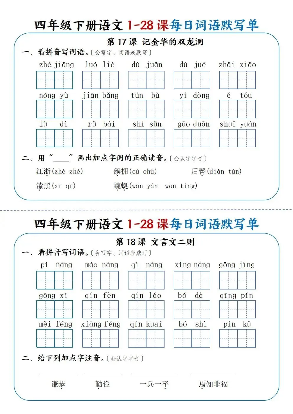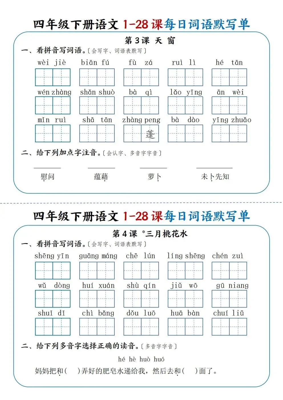 四年级下册语文1-28课每日词语默写单(电子版可打印)