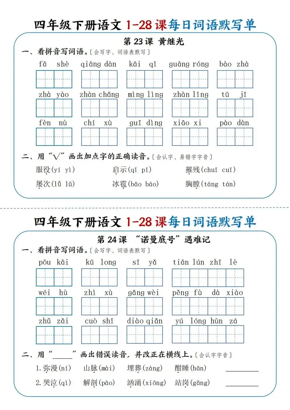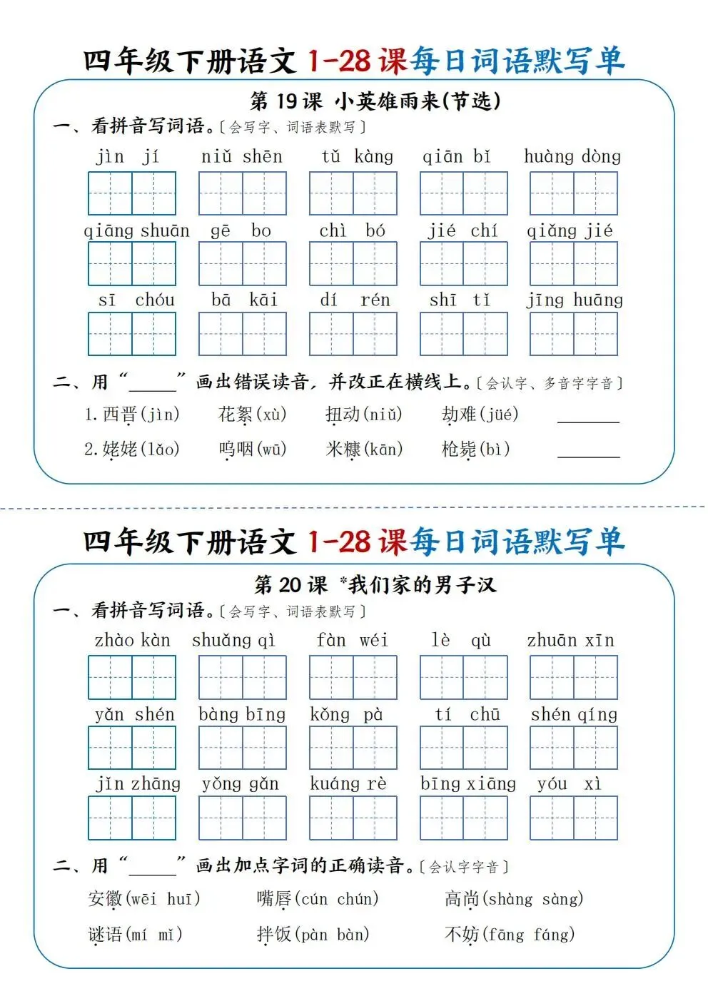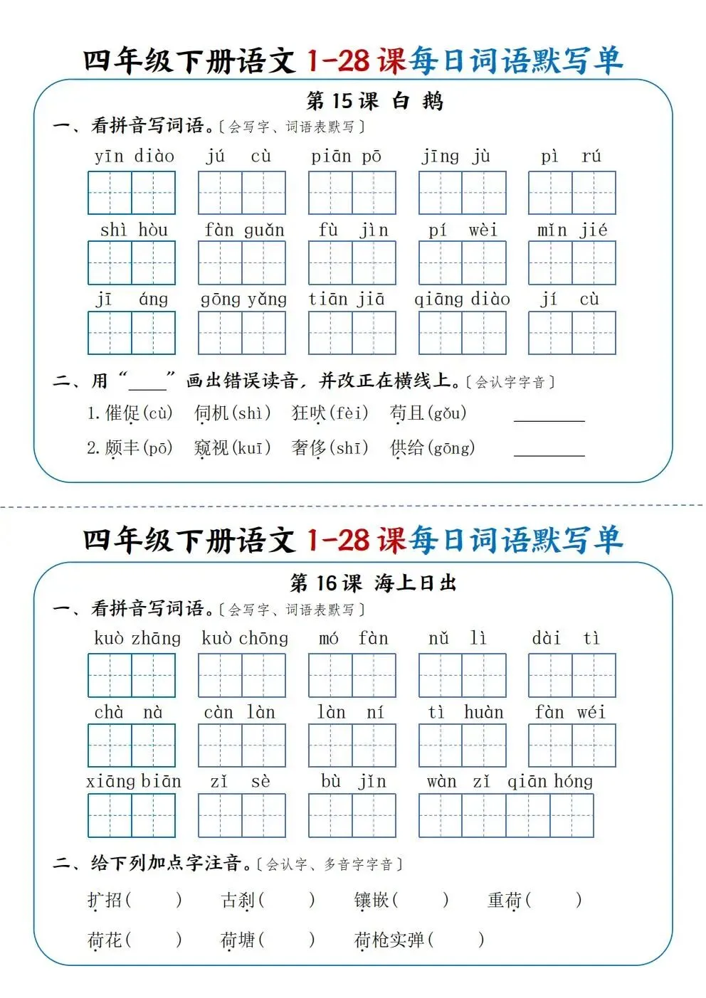 四年级下册语文1-28课每日词语默写单(电子版可打印)