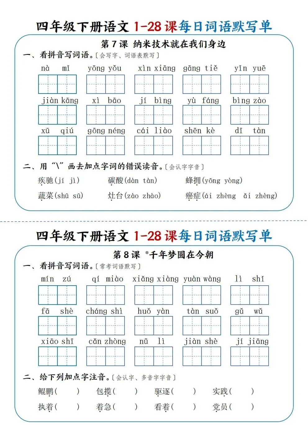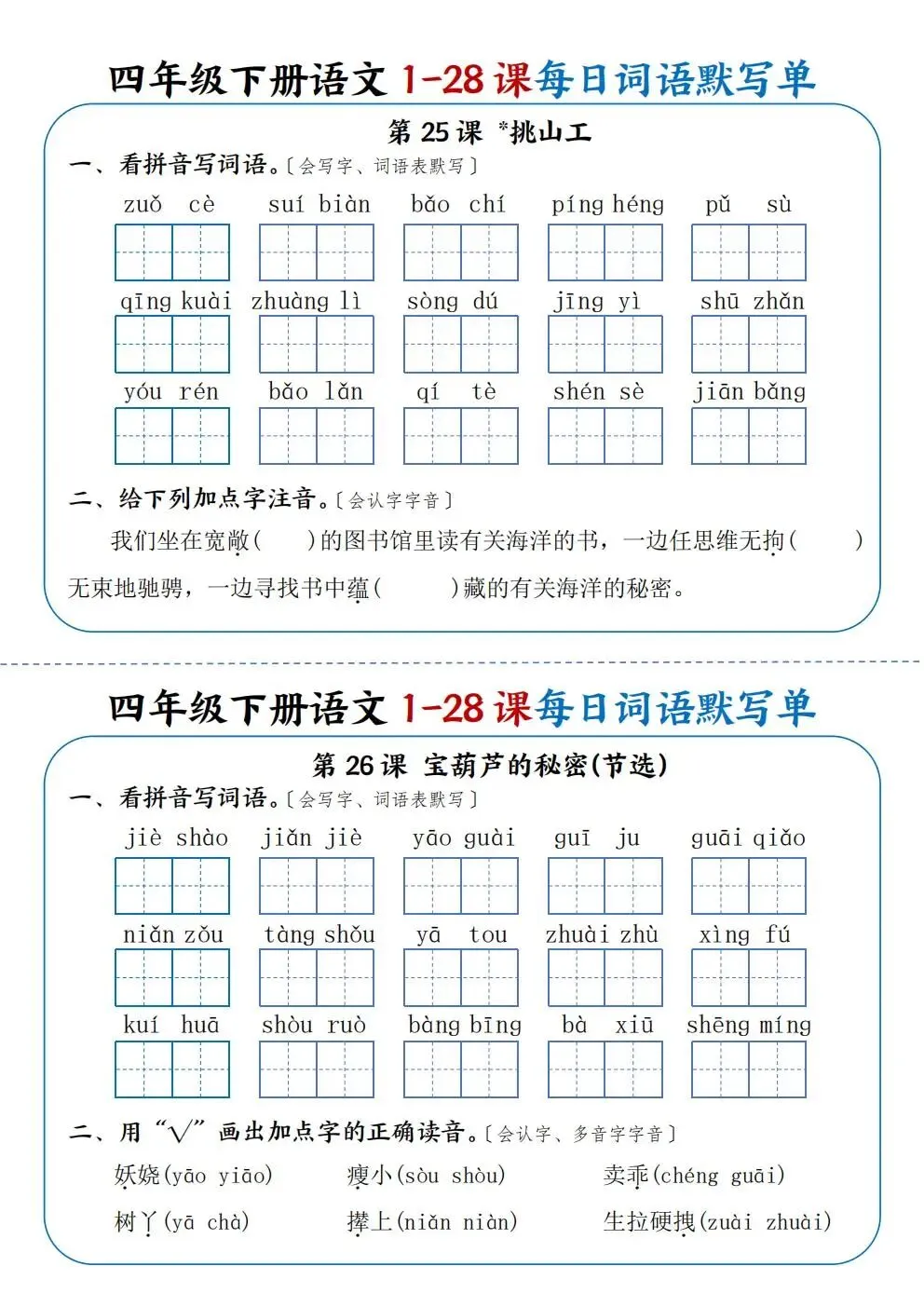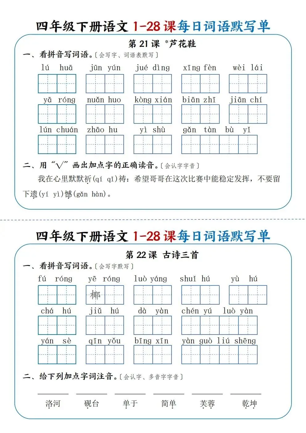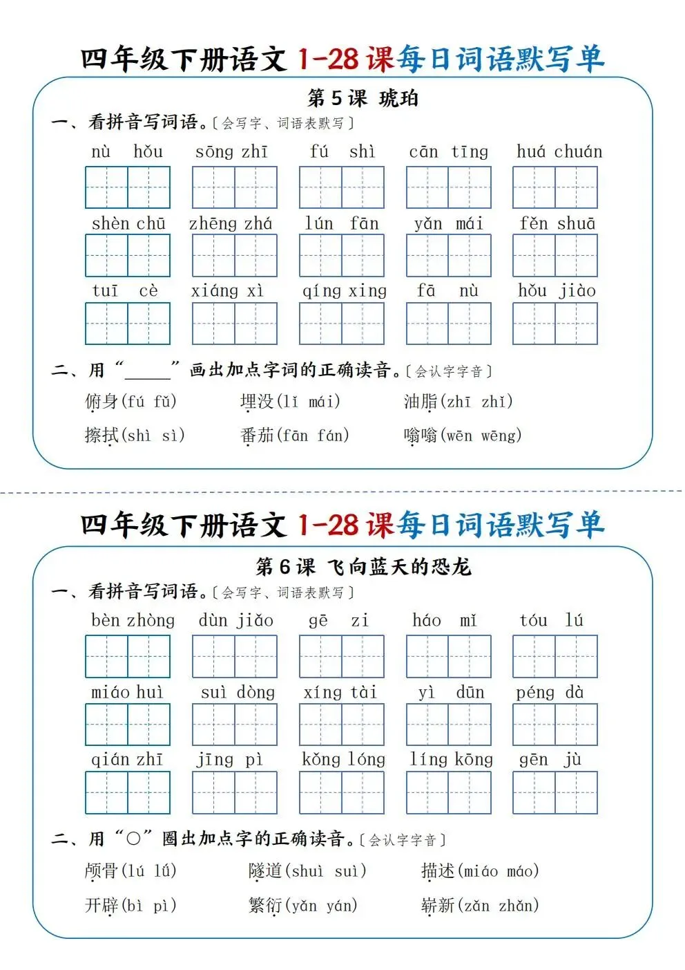 四年级下册语文1-28课每日词语默写单(电子版可打印)