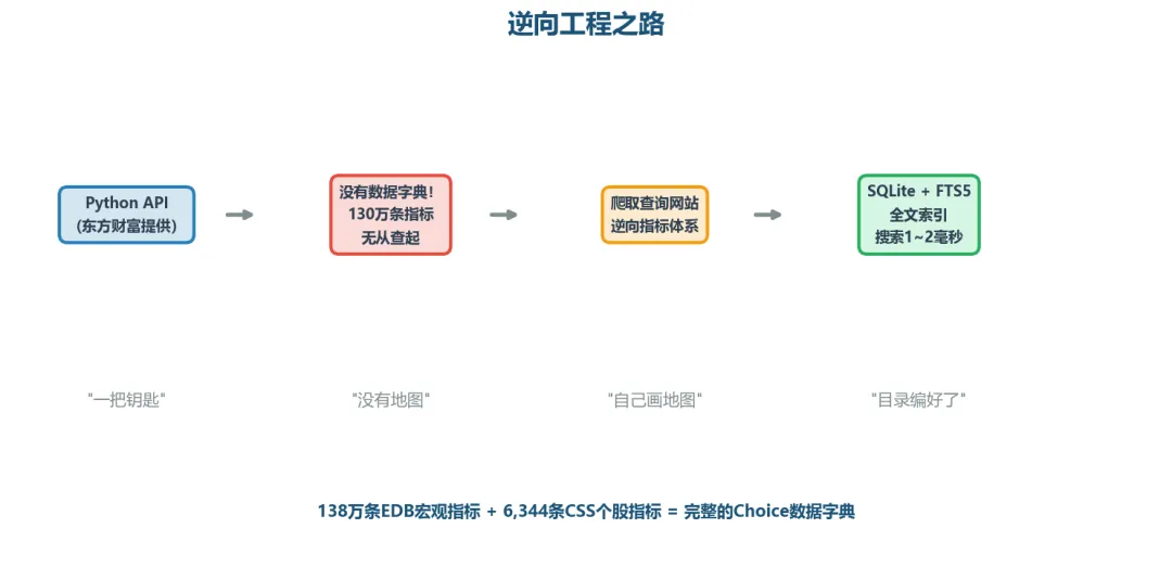 东方财富给了一个Python API(EMQuant),你可以调函数拉任意指标数据。但问题是——它没有写数据字典。你知道社融增量、PPI这些指标一定在系统里,但它们的指标代码是什么?在互联网上搜索不到。只能我人工去终端里一个一个找。