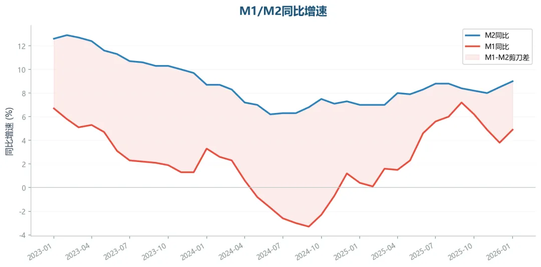 2026年1月M2同比9.0%,M1同比4.9%。