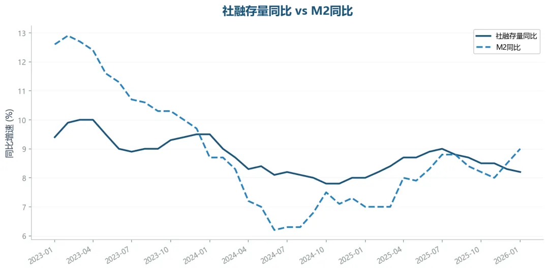 2026年1月社融存量同比8.2%,M2同比9.0%。