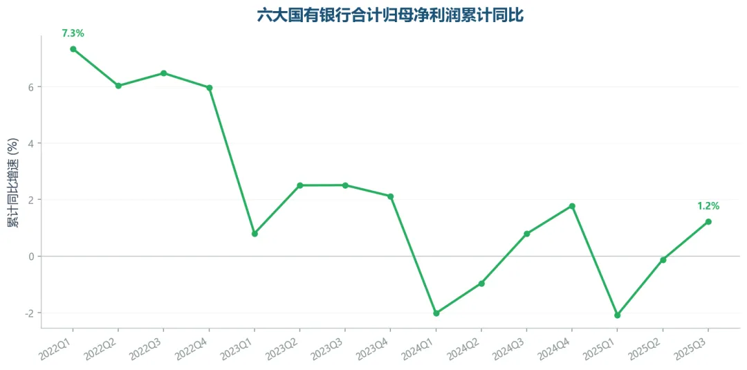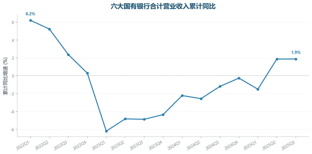 2025Q3,六大行合计营业收入累计同比+1.9%,归母净利润累计同比+1.2%。