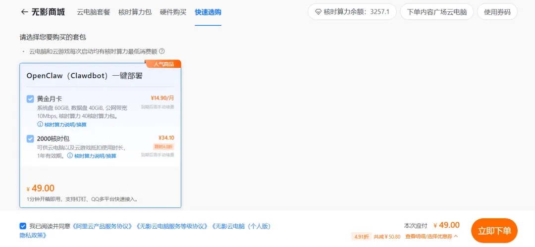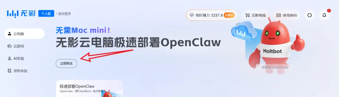 第三步:开通云电脑(openclaw版)