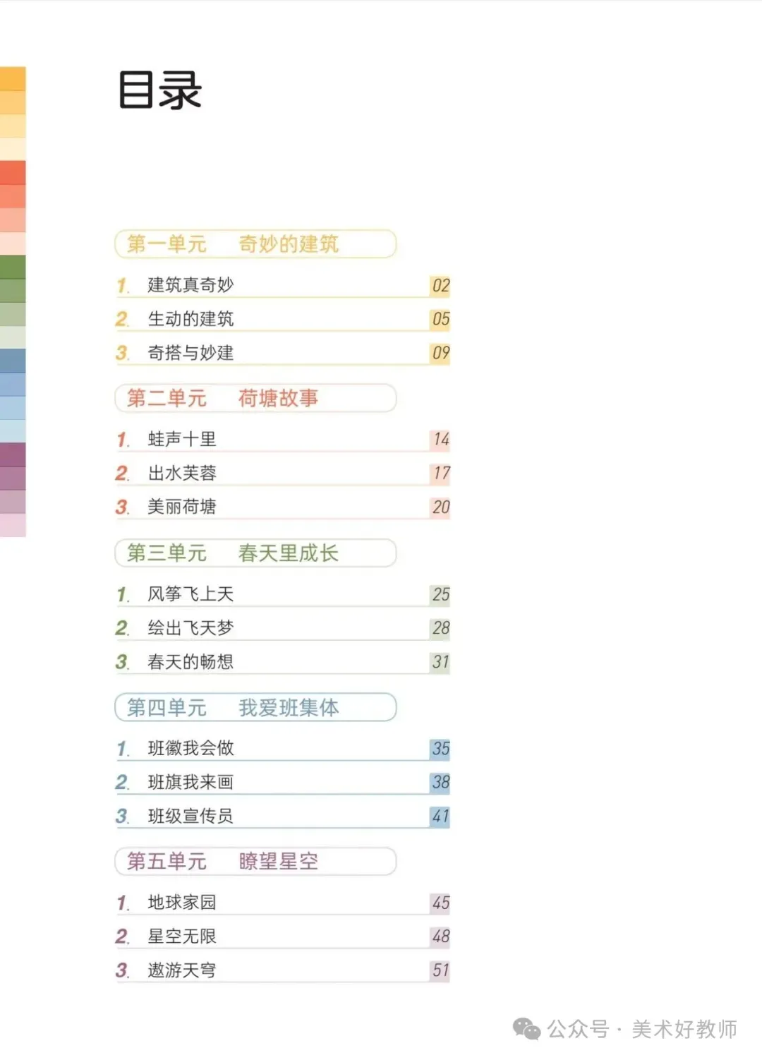 教材以“建筑”“荷塘”“春天”“班集体”“星空”五大单元组织内容,主题鲜明且贴近学生生活。单元内课程层层递进(如“奇妙的建筑”从认知、赏析到创作),体现了“感知—理解—创造”的学习逻辑。同时,内容融合了自然、科学、文学与社会实践(如“蛙声十里”关联诗词意境,“班徽设计”结合集体认同),呼应了新课标对跨学科学习的要求。