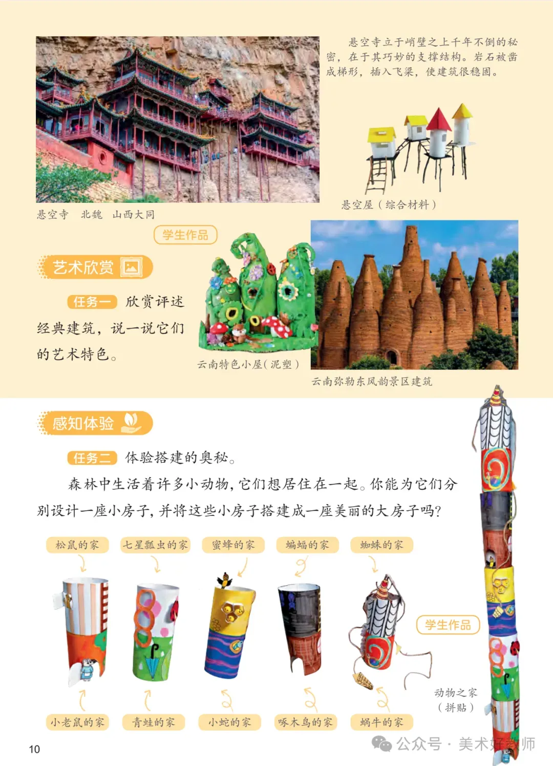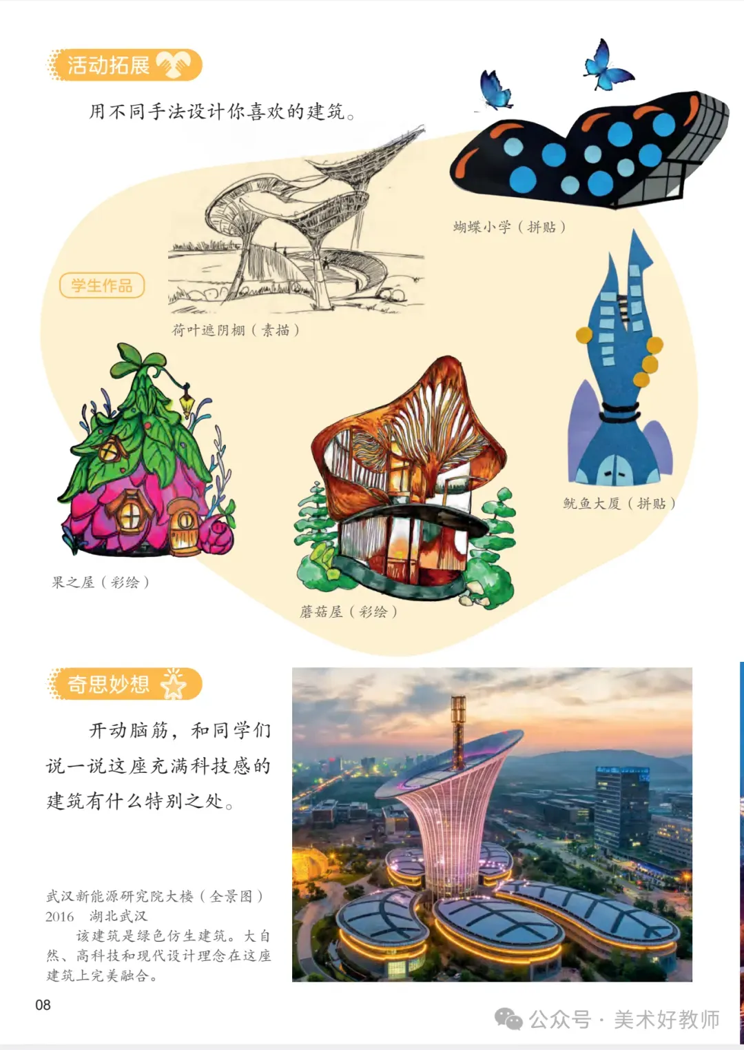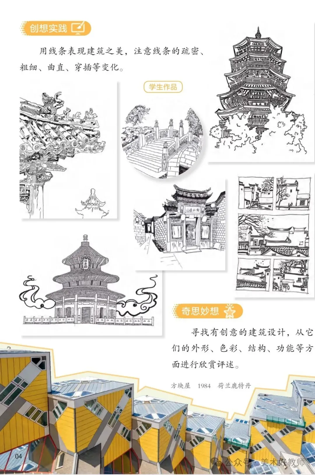 建议教师以单元核心概念(如“建筑与生活”“自然与艺术”)为主线,统筹课时目标。例如在“奇妙的建筑”单元中,可引导学生探究“建筑如何反映文化与功能”,将赏析、创作与实地考察(观察校园建筑)相结合,深化知识建构。