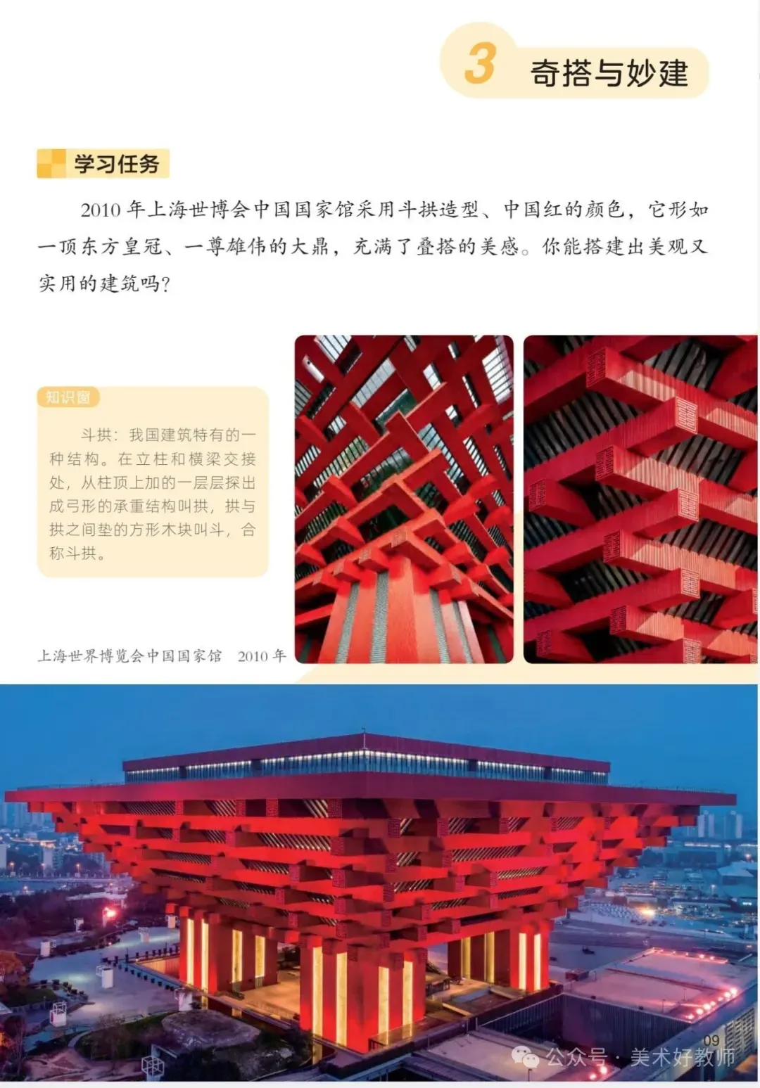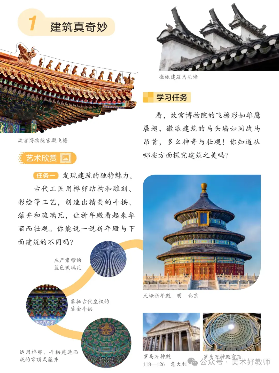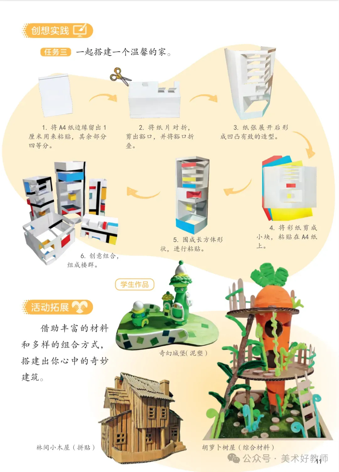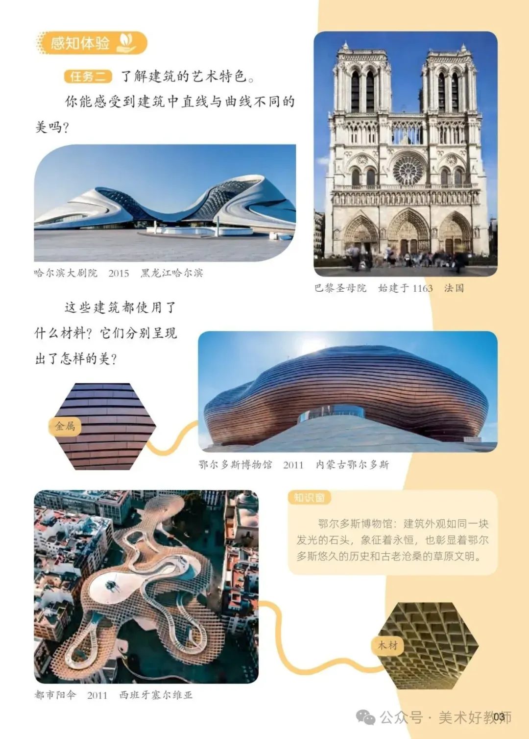 建议教师以单元核心概念(如“建筑与生活”“自然与艺术”)为主线,统筹课时目标。例如在“奇妙的建筑”单元中,可引导学生探究“建筑如何反映文化与功能”,将赏析、创作与实地考察(观察校园建筑)相结合,深化知识建构。