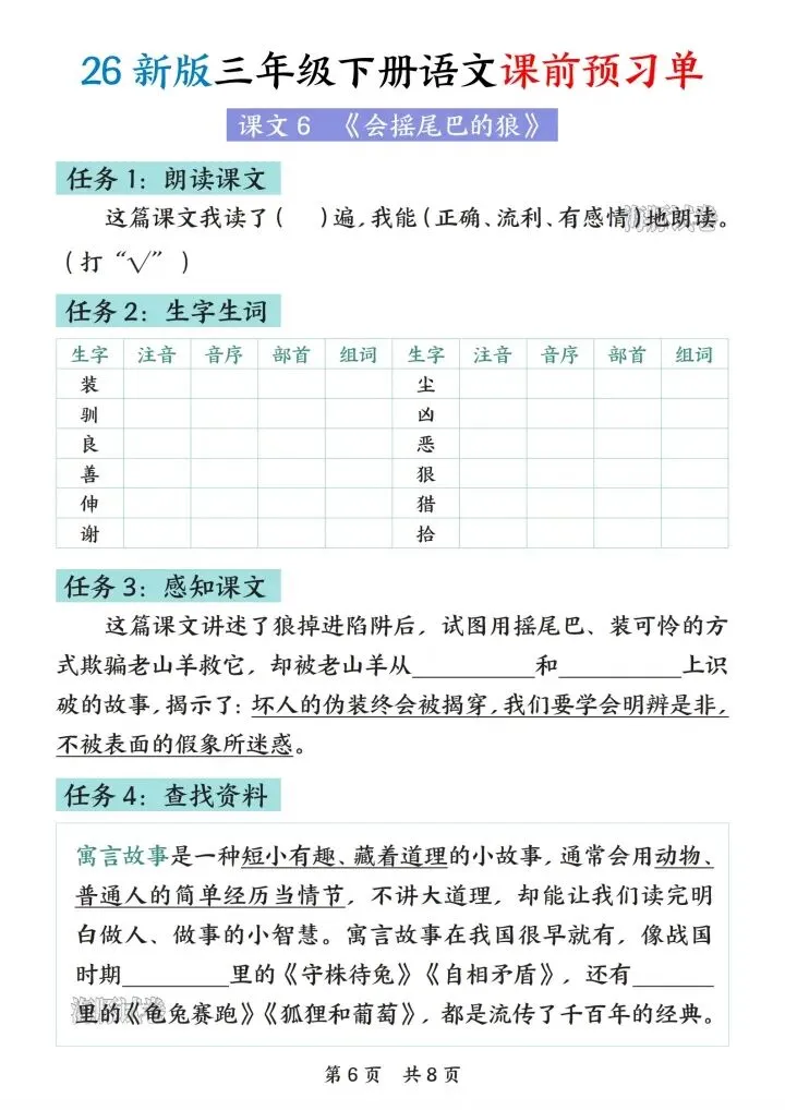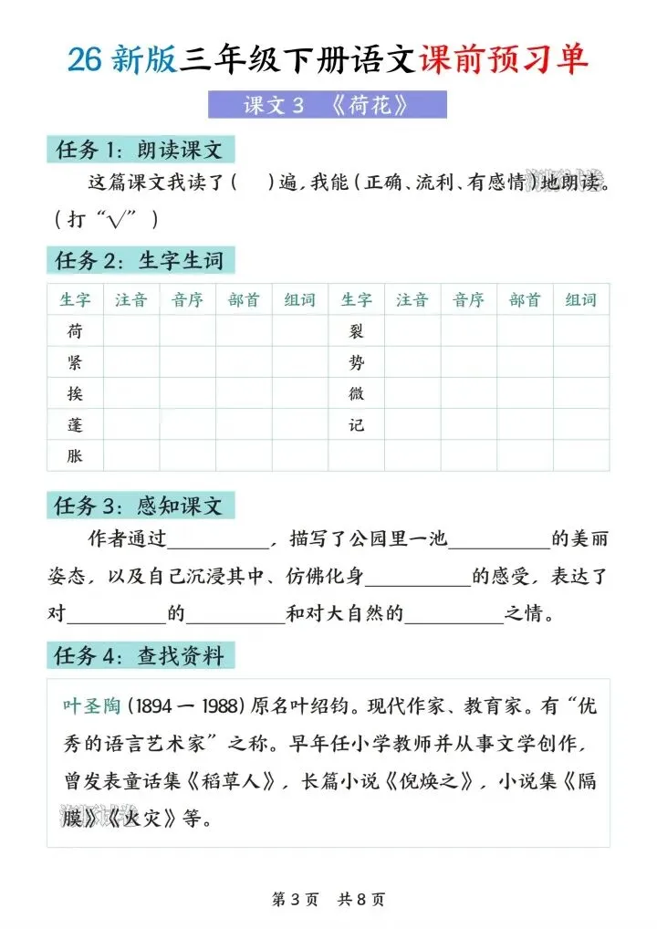26新版三年级下册语文课前预习单,电子版可下载打印!