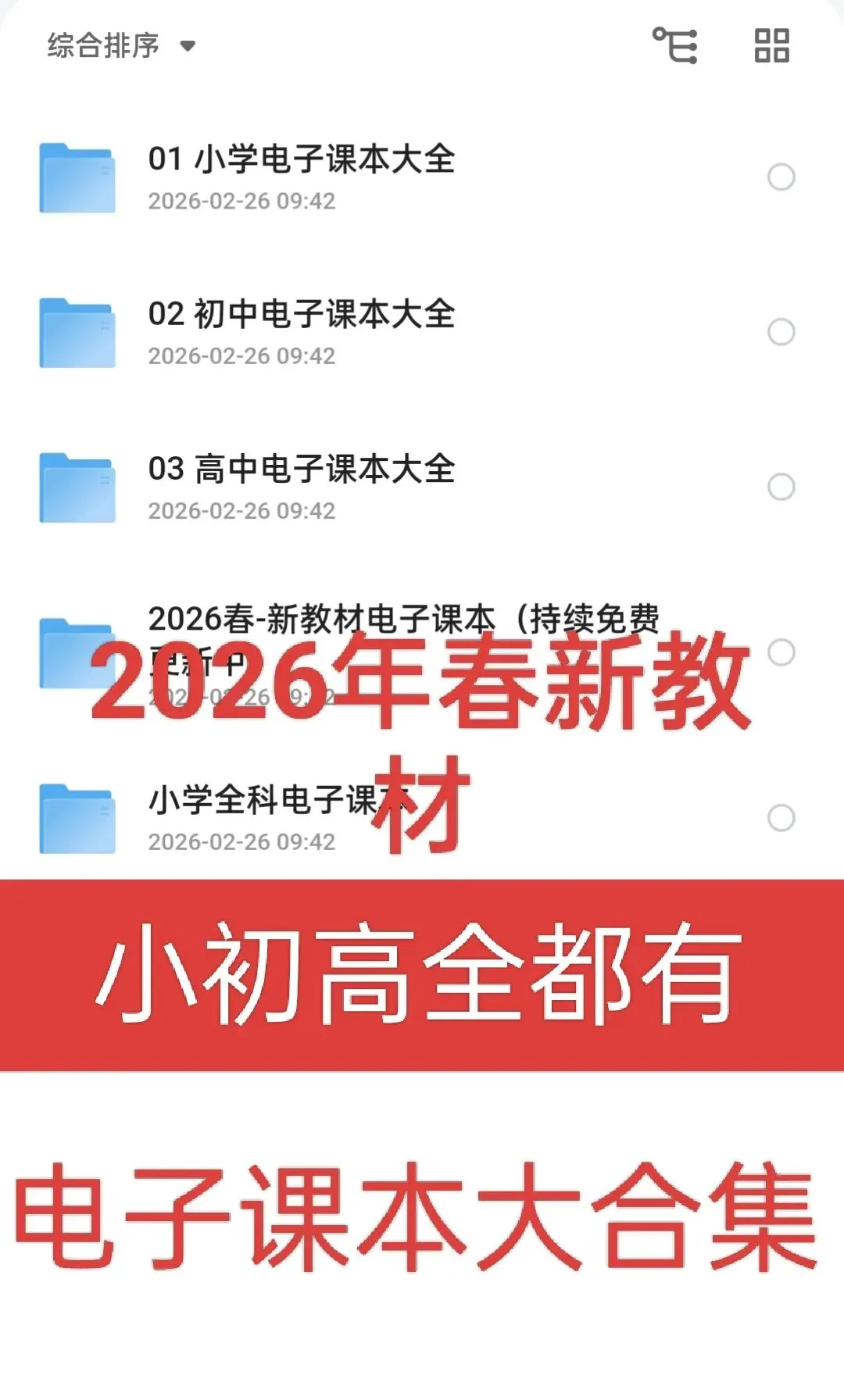 家长们好,为了帮助孩子们更便捷地进行预习和复习,这里整理了一份涵盖小学、初中、高中全学科的电子课本资源。手机、平板都能看,充分利用碎片化时间。2026春新版小学初中高中电子课本合集,语文、数学、英语、音乐、体育、美术、科学、品德与社会、历史、物理、化学全科覆盖,内容很全,适合开学用,电子版资料。