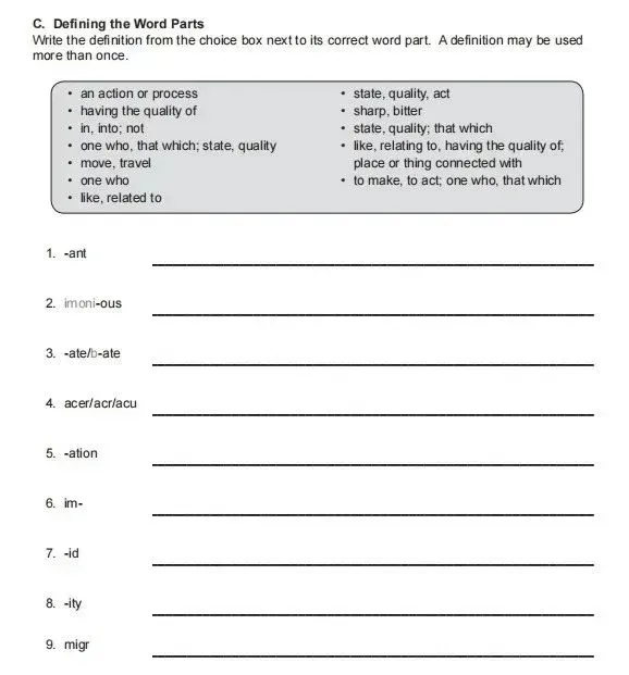 教材主要通过练习来学习词根使用方式,练习一般分为以下五个部分,我们来具体看看内页:A.Spelling and Defining Words:Match each given word to its correct definition.拼写和定义单词:将每个给定单词匹配其正确定义。B.Completing the Sentence:Complete the sentence by choosing the correct word.完成句子:通过选择正确的单词来完成句子。C.Defining the Word Parts定义单词部分。 D. Writing Sentences:Write sentences using the words in the lesson. 写句子:用课程中的单词写句子。 E. (optional) Creative Writing 创造性写作(Optional)说完了教材我们再来看看资源中另外2本练习册。前5本词根是只告诉你个这词根怎么用,但是没有告诉你个这词根怎么的来,我后们面补的充这2本练习册是告诉你每个词根怎么的来,学了词根么怎来的再去做题,很就容易理解。了
