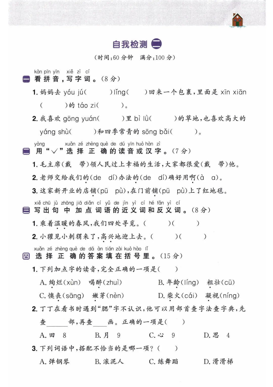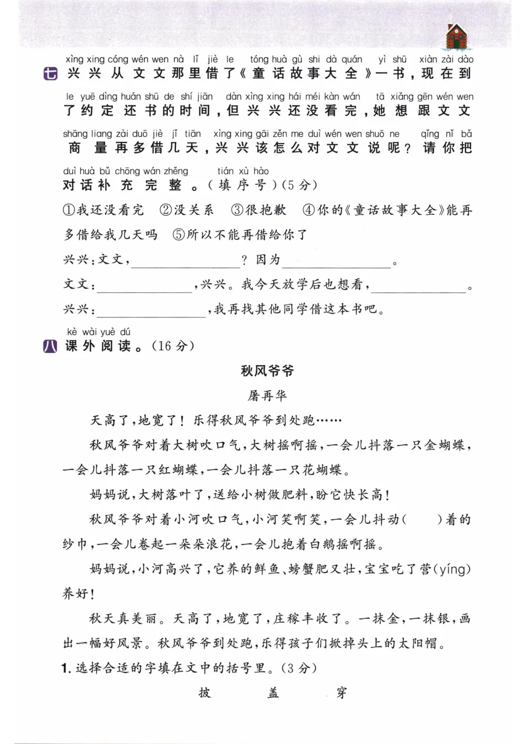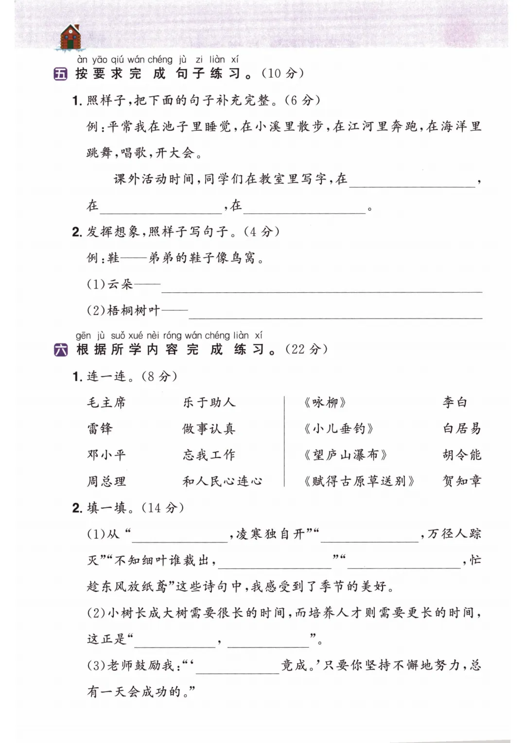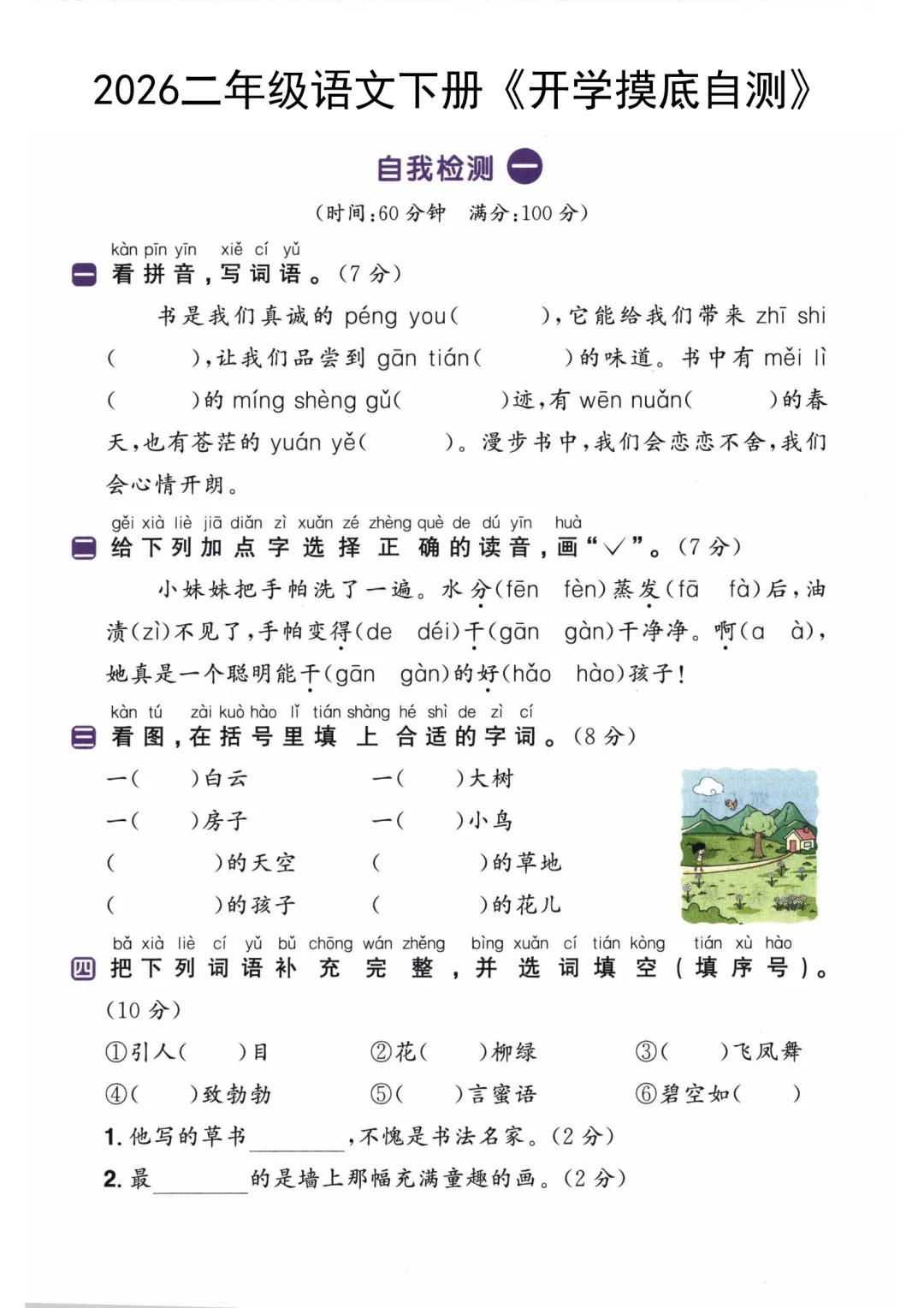 二年级下册语文《开学摸底测试卷》电子版可打印