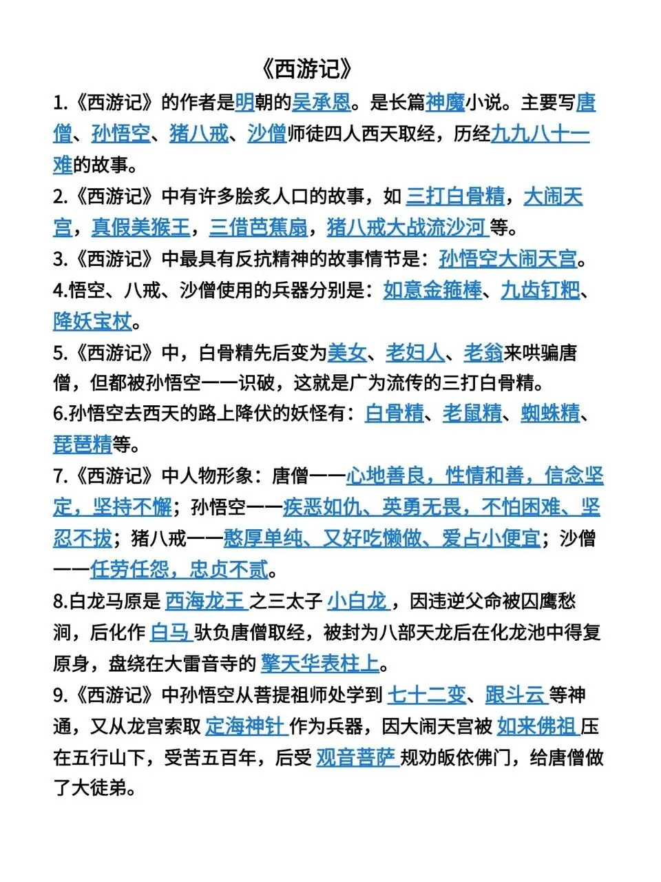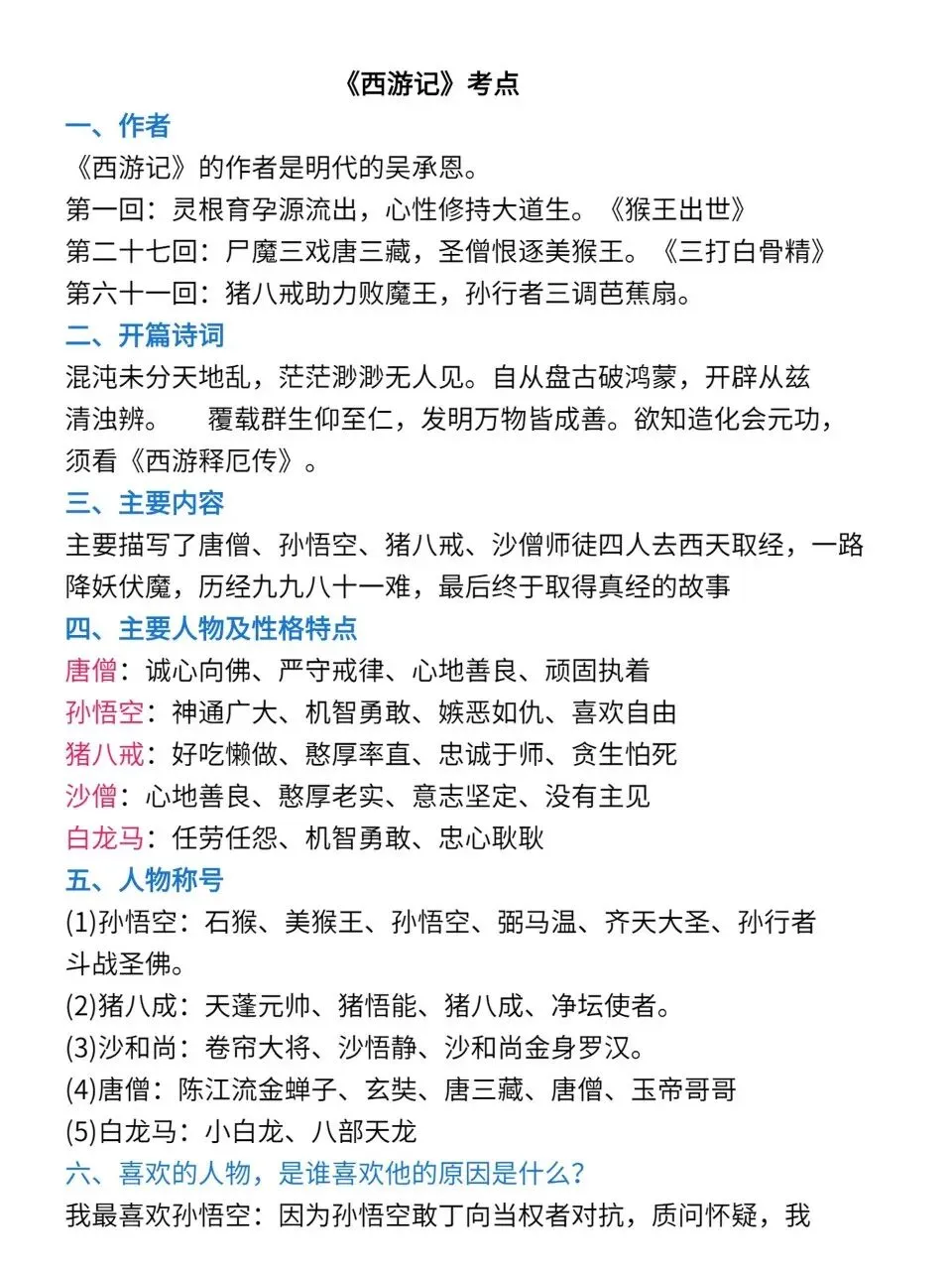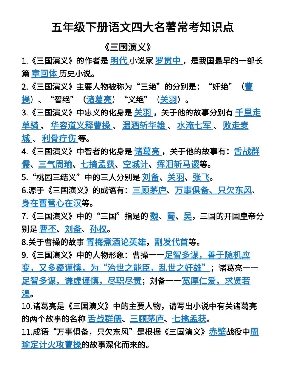 今日分享五年级下册语文四大名著常考知识点(完整电子版可打印)!高清电子版可直接打印,排版规整适配练习,不用费心整理,孩子每日一练夯实基础,家长辅导省心!