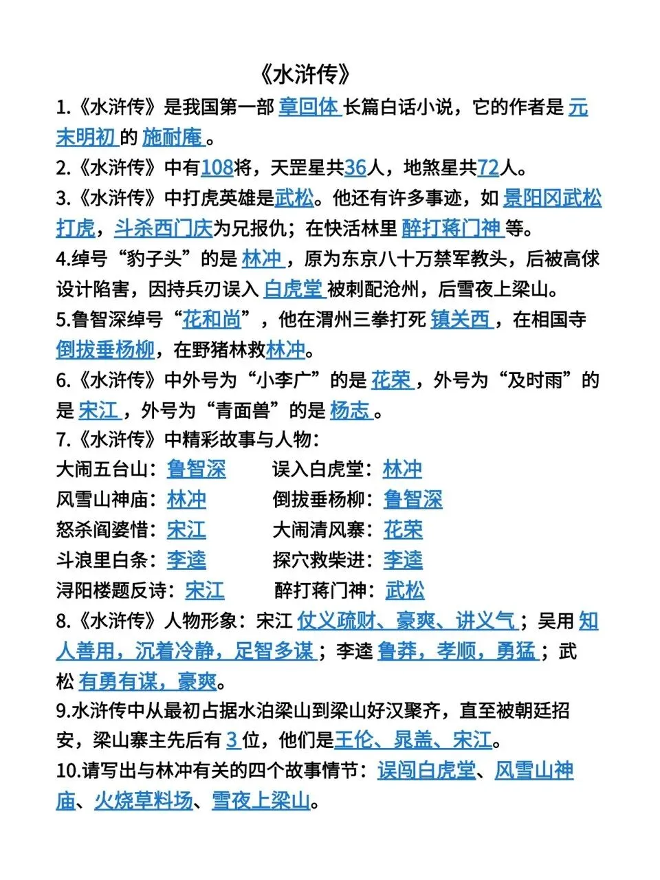 五年级下册语文四大名著常考知识点(完整电子版可打印)