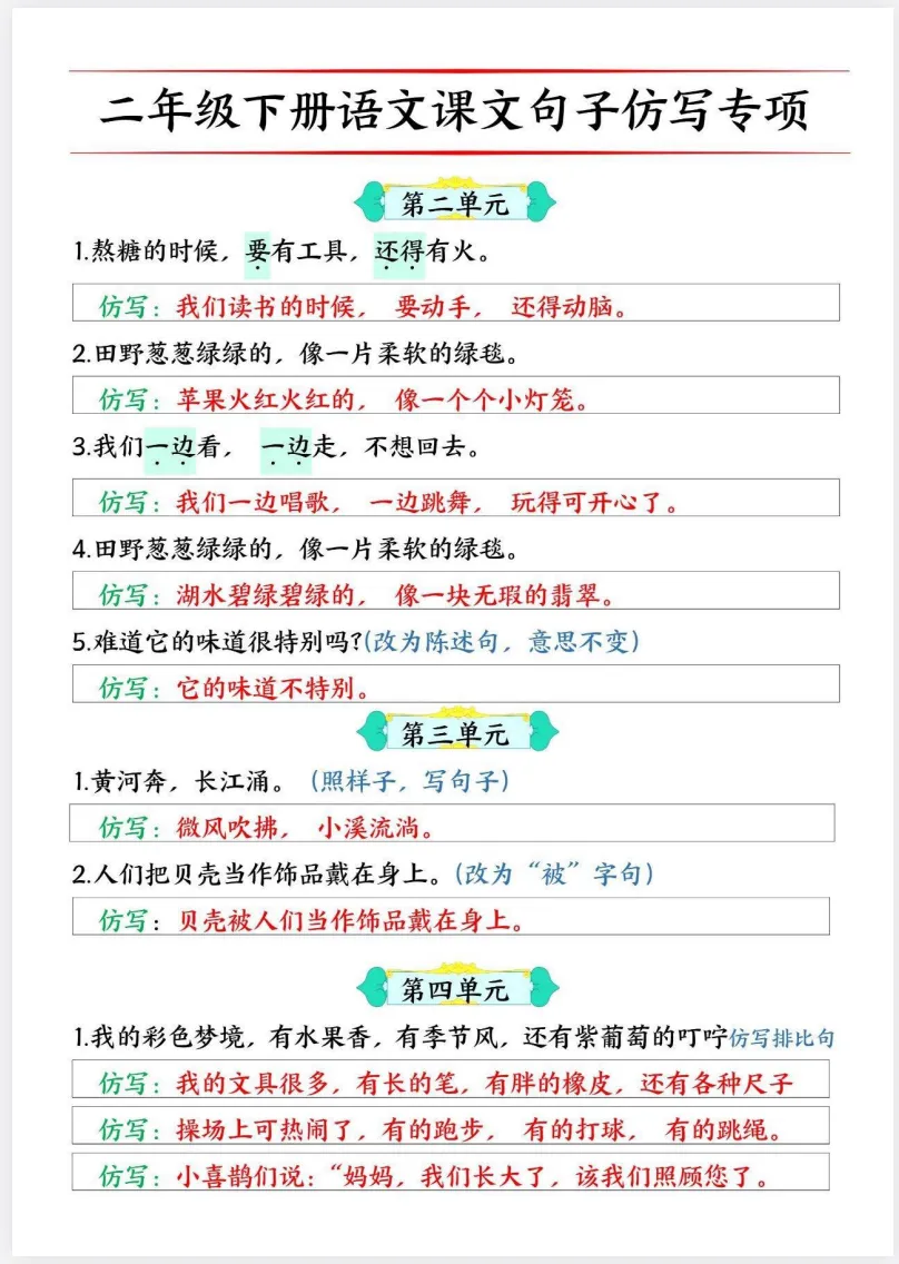 二年级下册语文,句子仿写是作文提分的关键!这份专项练习按单元整理,从连续动词、比喻句、排比句到 “被” 字句、反问句,覆盖全册重点句式。每道题都有范例和仿写思路,孩子跟着练,既能掌握句式结构,又能积累优美表达,作文水平轻松提升,考试更自信!