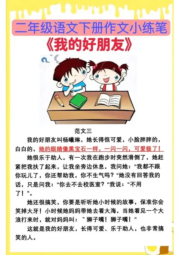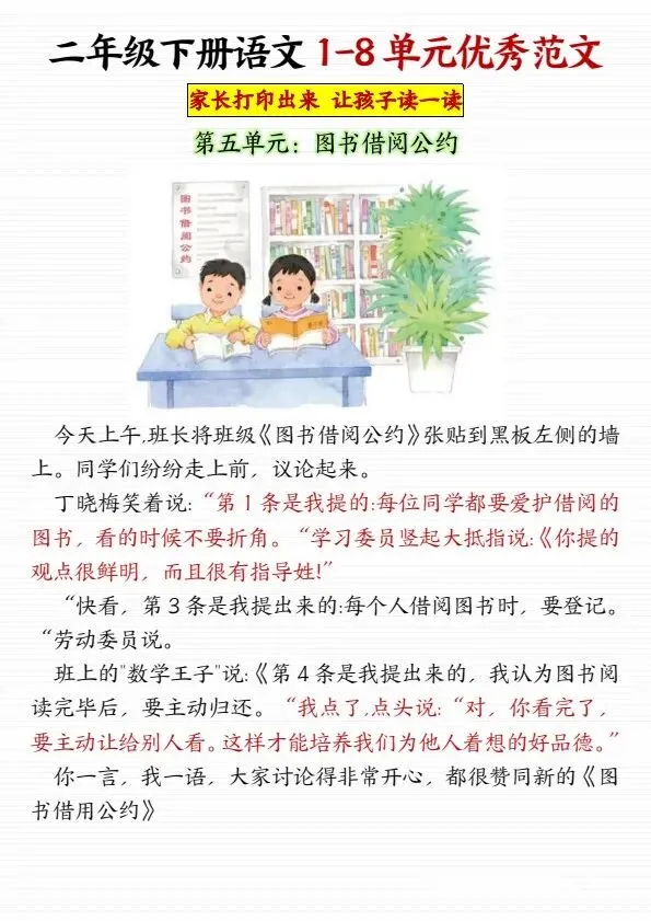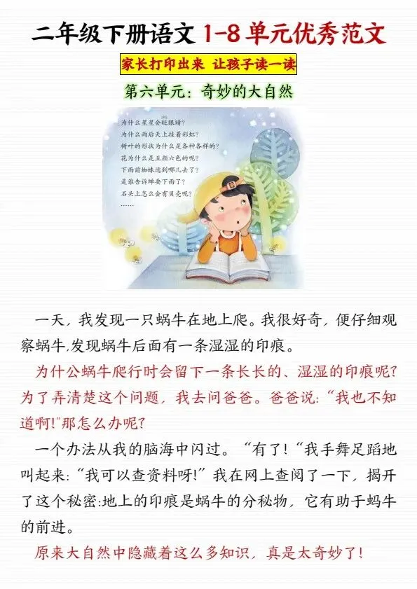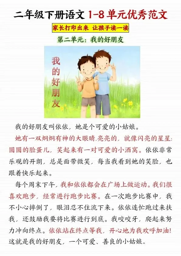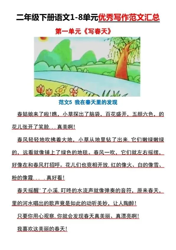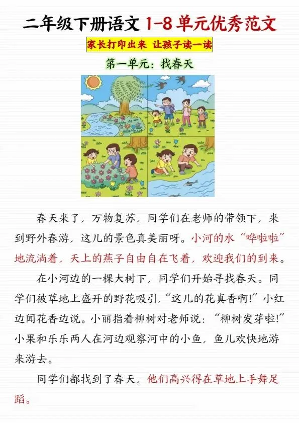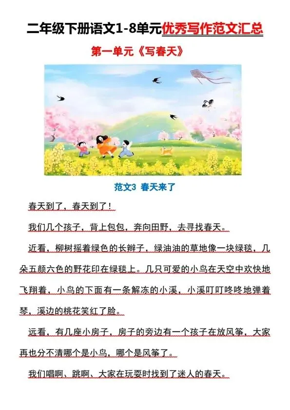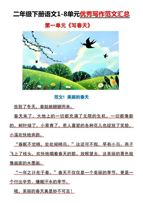 今日分享二年级下册语文1-8单元优秀范文(完整电子版可打印)!高清电子版可直接打印,排版规整适配练习,不用费心整理,孩子每日一练夯实基础,家长辅导省心!