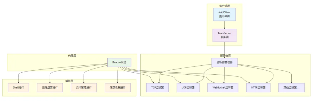 AVAS 采用经典的 C2(Command and Control)架构,由服务端(TeamServer)、客户端界面(AVASClient)和被控端代理(Beacon)三部分组成。