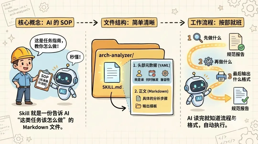 就像你给一个新同事写了一份 SOP(标准操作流程),AI 读完就知道该先做什么、再做什么、最后输出什么格式。
