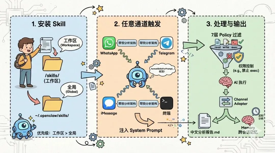 Claude Code 直接把 SKILL.md 加载到上下文里。OpenClaw 则是在 Agent 启动时,通过buildAgentSystemPrompt→formatSkillsForPrompt把所有可用 Skills 格式化成一段 compact XML 列表,注入到 system prompt 中。AI 看到用户消息后,再从这个列表里”选中”合适的 Skill 来执行。