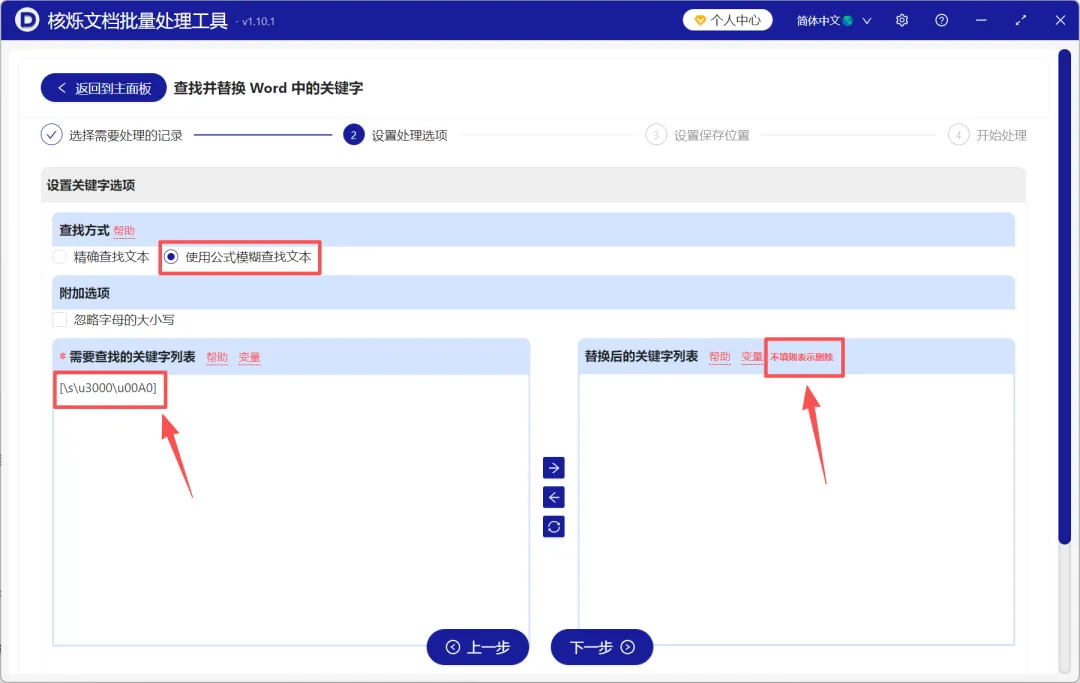 3、选择【使用公式模糊查找文本】,在【查找的关键字列表】输入以下公式:[\s\u3000\u00A0]。右边【替换后的关键字列表】不填任何内容,则表示删除。