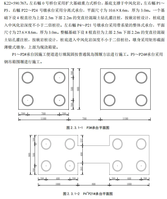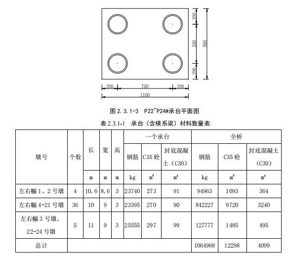 本次设计针对跨海特大桥1#~24#承台围堰施工方案。左右幅P1P3、右幅P22P24号墩承台采用分离式承台,P1P2 承台平面尺寸为10.6m×8.6m,厚为3.0m,封底混凝土厚度定为0.8mP3P22P24 承台平面尺寸为11m×9m,厚为3.0m,封底混凝土厚度定为0.8m。左右幅 P4P21 号墩承台采用带系梁的整体式承台,平面尺寸为28×9m,厚为3.0m,中间系梁尺寸为8×4×2m,封底混凝土厚度定为0.8m。承台及横系梁采用C35 混凝土,封底为C20 混凝土,钢筋采用HRB400 钢筋,承台及横系梁主筋直径为32mm28mm25mm,钢筋采用直螺纹机械接头接长。