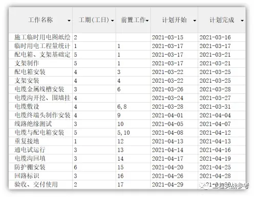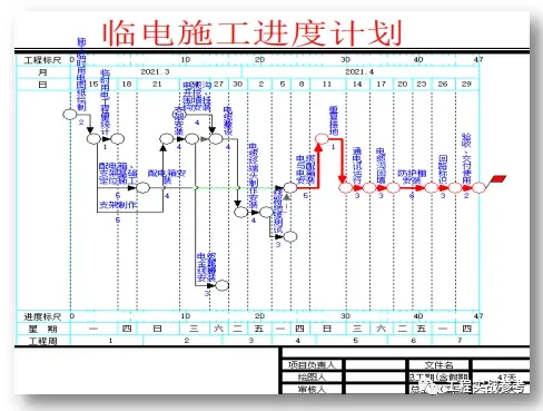 总施工进度计划规定临时用电施工工期为:20213月15日至2021430日,合计47天。根据以上工期,编制详细临时用电施工进度计划如下: