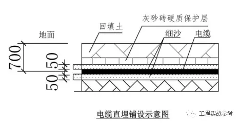 5)电缆在室外直接埋地敷设的深度应不小于0.7m,并应在电缆上下各均匀铺设不小于50mm厚的细砂,然后覆盖砖等硬质保护层。