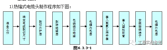 2)热缩式电缆终端头制作,加热器采用电吹风。制作前选择与电缆截面相适应的热缩塑料手套。在安装分支手套时,宜先进行预热,并将电缆定位,套上分支手套后,按所需分叉角度摆好线芯后再进行加热。加热收缩时,应从钢管中间向两端逐渐延伸,或从一端向另一端延伸,以利于收缩时排出管内空气,加热火焰应螺旋状前进。热缩电缆头如下图: