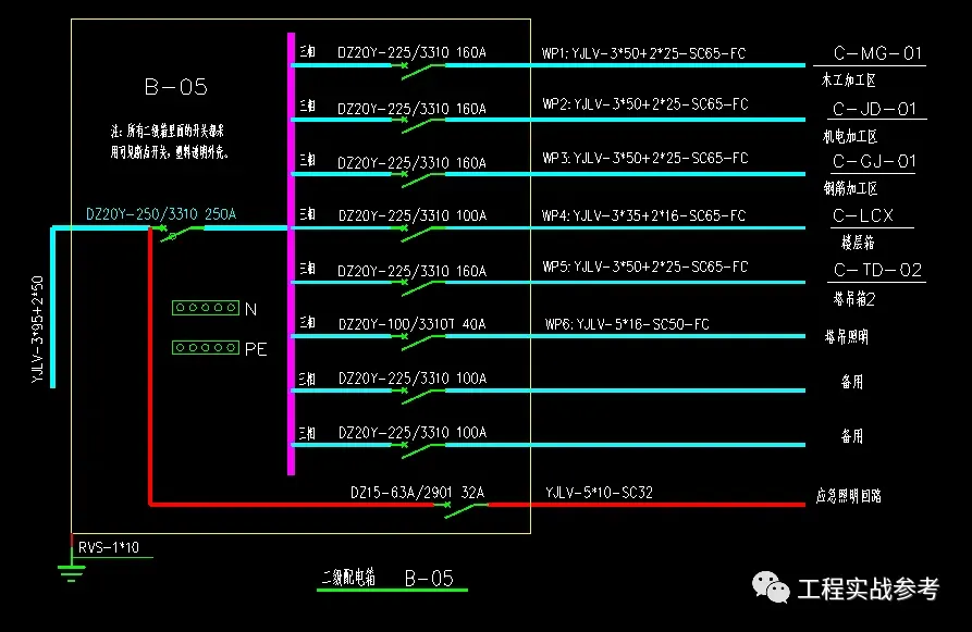 1)电箱中设两块端子板(工作零线N 与保护零线PE),保护零线端子板与金属电箱相连,工作零线端子板与金属电箱绝缘。