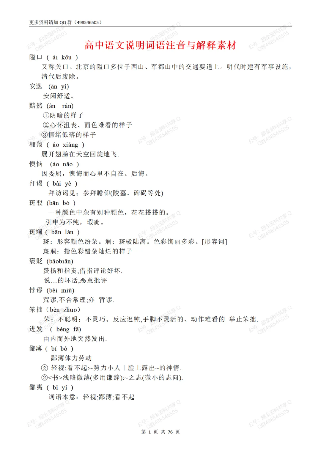高中语文说明词语注音与解释素材(pdf分享) 【最新试卷】 2024北京东城高三【一模】全科试题及答案(pdf分享) 2024北京西城高三【一模】全科试题及答案(pdf分享) 2024北京海淀高三【一模】全科试题及答案(pdf分享) 2025北京海淀区高一(上)期末卷合集及答案(pdf分享) 2025北京海淀区高二(上)期末卷合集及答案(pdf分享) 2025北京海淀区高三(上)期末卷合集及答案(pdf分享) 2025北京东城区高一(上)期末卷合集及答案(pdf分享) 2025北京东城区高二(上)期末卷合集及答案(pdf分享) 2025北京东城区高三(上)期末卷合集及答案(pdf分享) 2025北京朝阳区高一(上)期末卷合集及答案(pdf分享) 2025北京朝阳区高二(上)期末卷合集及答案(pdf分享) 2025北京朝阳区高三(上)期末卷合集及答案(pdf分享) 2025届高三八省八校联考(全九科)试题及答案(pdf分享) 看文末有获取打印版方式 (完整版76页,部分展示) 上文和下面资料在QQ群498546505下载 【高中语文知识总结】 1.高中语文必修1-必修5文化常识汇编(pdf分享) 2.人教版高中语文必修1-5全部文言文知识点梳理(pdf分享) 3.高中语文必修1-5理解性默写练习+答案(pdf分享) 4.统编版高中语文必修上册必背篇目理解性默写(pdf分享) 5.高中语文新课标必背篇目 72 篇(pdf分享) 6.高中语文思维导图(pdf分享) 7.高中语文文学常识(pdf分享) 8.古诗文基础知识-统编版高中语文必修下册(pdf分享) 9.2023高考语文知识复习清单之易混成语辨析(pdf分享) 10.高考语文名句名篇默写100题及答案(pdf分享) 11.高中语文必修1-5知识点汇总(pdf分享) 12.高中语文必修二知识点汇总(pdf分享) 13.高中语文必修 1-5 文言文重点句子翻译+通假字全汇总(pdf分享) 14.高中语文《红楼梦》必考知识点最全整理(pdf分享) 15.高考文言文必考知识点(打印版)(pdf分享) 16.高中必背古诗文一句一译,高考名句、古文和易错字一举三得(pdf分享) 17.高考语文素材大全(课内外)上册(pdf分享) 18.高考语文素材大全(课内外)下册(pdf分享) 19.高考语文文言文常见古今异义词145例(精编版)(pdf分享) 20.高考语文病句习题练习(含答案)(pdf分享) 21.统编版高中语文必修下册必背篇目理解性默写(pdf分享) 22.高中语文必修 1-5 课本作文素材(pdf分享) 23.高考文言文必考知识点(打印版)(pdf分享) 24.统编版高中语文必修上册文言文知识整理汇总(pdf分享) 25.统编版高中语文必修下册文言文知识整理汇总(pdf分享) 26.高中语文必修上下册+选择性必修上中下册知识点梳理(pdf分享) 27.高中语文(必修1-5+选修)文学常识超全汇总(pdf分享) 28.高考语文【词语、语病、补写】专题复习(带答案)(pdf分享) 29.统编版高中语文选择性必修上中下册理解性默写汇编及答案(pdf分享) 30.部编人教版高中语文必修三【1-4】单元知识点总结合集(pdf分享) 31.部编人教版高中语文必修四【1-4】单元知识点总结合集(pdf分享) 32.高考语文复习古诗词阅读(pdf分享) 33.高考语文文言文常见古今异义词145例(精编版)(pdf分享) 34.新高考理解性默写之意象关键词类题目60练(pdf分享) 35.(超详)高中语文知识点归纳汇总(pdf分享) 36.高考名句默写60组考前强化训练(pdf分享) 37.高中语文《乡土中国》练习题超全汇编+答案解析(pdf分享) 38.高中语文《论语》知识点梳理(pdf分享) 39.高中语文易混成语辨析(pdf分享) 40.高中语文《儒林外史》知识点总结(pdf分享) 41.高中语文64篇之长难古诗文突破(附答案)(pdf分享) 42.高考语文古诗词必背重点提纲(pdf分享) 43.高考语文常考的古代文化常识(pdf分享) 44.高考语文复习最全梳理(附答题模板)(pdf分享) 45.高考语文必背文言文实词虚词(pdf分享) 46.高考语文文言文120实词和18虚词(pdf分享) 47.高中语文48组文言高频词超全归类(pdf分享) 48.高考语文字音字形复习必备(pdf分享) 49.高中语文全部知识点归纳(pdf分享) 50.高中语文中国古代文化常识分类详细梳理(上篇)(pdf分享) 51.高中语文中国古代文化常识分类详细梳理(中篇)(pdf分享) 52.高中语文中国古代文化常识分类详细梳理(下篇)(pdf分享) 53.统编版高中语文必修上下册理解性默写汇编及答案(pdf分享) 54.高中文言文阅读之特殊句式解析(pdf分享) 55.高考语文病句修改50题(含答案)(pdf分享) 56.统编版高中语文必修上册课文知识点梳理(pdf分享) 57.高中语文古代诗词名句900句(pdf分享) 58.最新完整版高中古诗文必背72篇(含注音、翻译)(pdf分享) 59.高中语文诗词集锦(pdf分享) 60.高中语文课本中词语的正确使用(pdf分享) 61.高考语文一轮复习《文学类阅读(散文类)》专练(含答案)(pdf分享) 62.高考语文一轮复习《文学类阅读(小说类)》专练(含答案)(pdf分享) 63.高中文言文精短翻译训练100篇(pdf分享) 64.高中语文知识点全汇总(pdf分享) 65.高中语文120个文言实词精编汇总清单(pdf分享) 66.高考语文古代文学常识总结(pdf分享) 67.高中语文《边城》 知识点总结(pdf分享) 68.高考语文文言文 120 个实词及其例句翻译(pdf分享) 69.高考语文文言文复习之120个实词(含课本例句、成语助记、故事助记)(pdf分享) 70.新课标高中语文必修一至五文言文大全(pdf分享) 71.高中语文学科体系思维导图(pdf分享) 72.高中语文《劝学》知识清单(pdf分享) 73.高中语文《廉颇蔺相如列传》知识清单(pdf分享) 74.高中语文《陈情表》 知识点精讲(pdf分享) 75.高中语文中的100个写作难题(pdf分享) 76.高中语文必考文学常识200题(pdf分享) 77.高中语文常用成语积累(pdf分享) 78.高中语文《