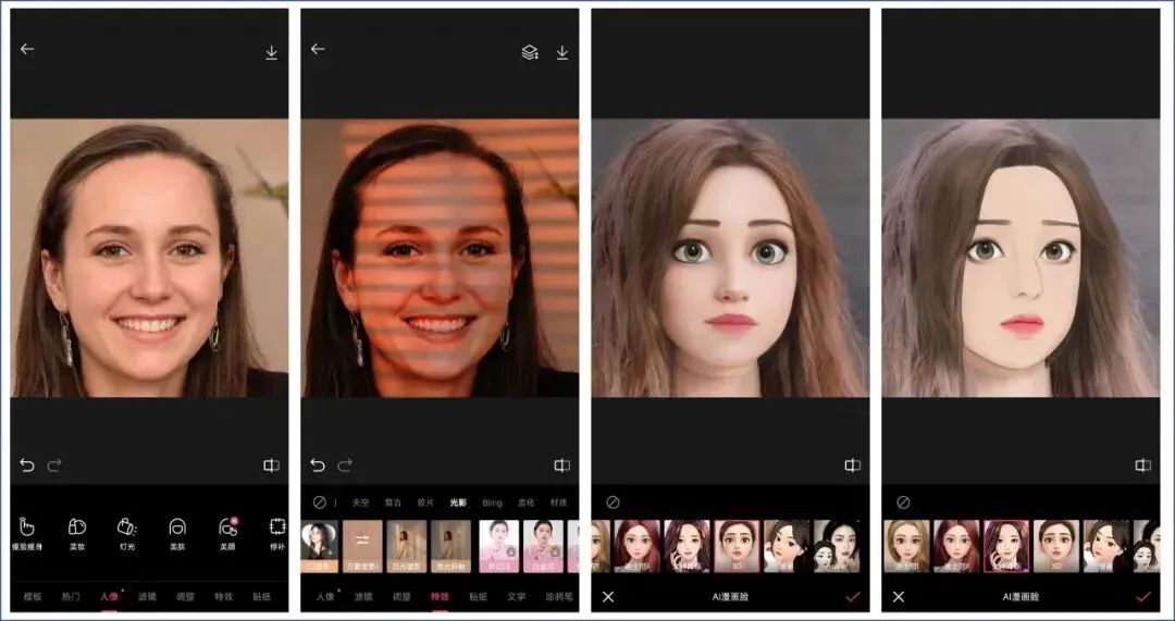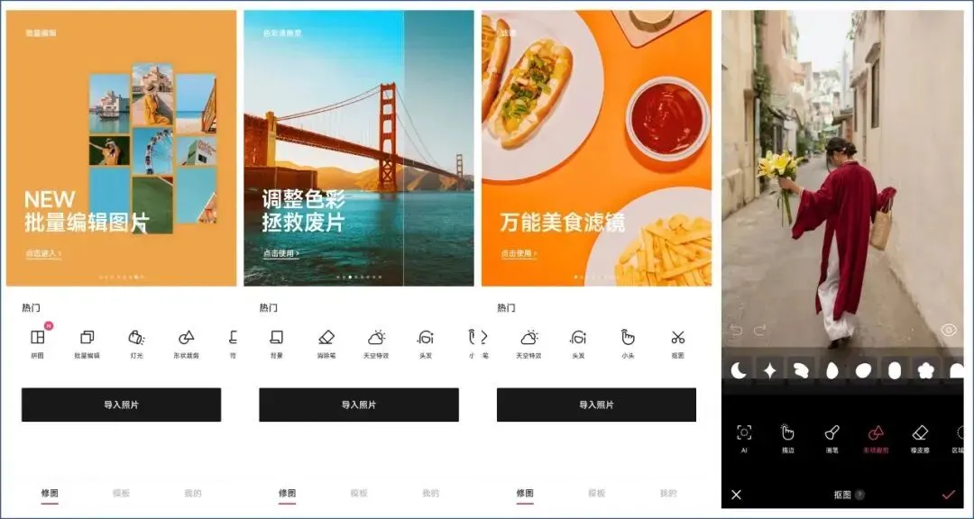 首先,它支持的图片处理功能全面丰富,包括:多张图片拼图、图片批量处理、图片多种形状裁剪、图片抠图、图片一键去除多余的物体、图片 AI 漫画脸、图片特效、图片贴纸和文字、图片滤镜、图片模板和海报、图片调整等。