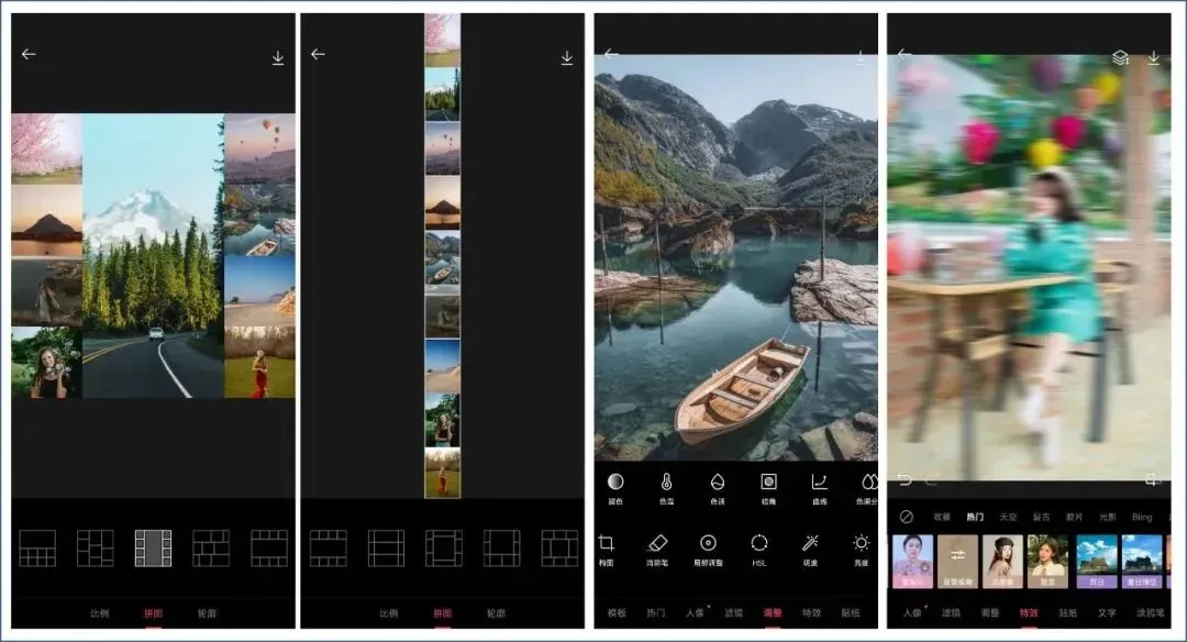 它的图片调整功能包括:构图、消除笔、局部调整、HSL 、亮度、对比度、饱和度、色彩清晰度、锐化、颗粒、高光、阴影、褪色、色温、色调、暗角、曲线、色调分离。