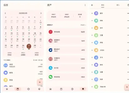 它支持的功能包括:一键快速记账、预算管理、年预算、月预算、周预算、分类预算、日历账单、新建账本、账本管理、账单搜索、资产管理、图表分析、支出收入添加分类、记账备注、连续记账、账户转入转出、导入账单、导出账单、数据云同步、桌面小组件。