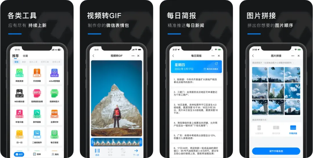 功能有网络测速、视频转GIF、计数器、手持弹幕、亲威关系计算等,想用的时候打开即用,超方便。