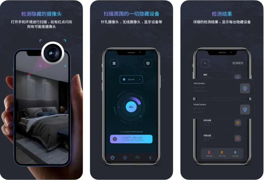 如果检测出除了自己携带的以外的不明电子设备,那就要格外注意这个房间是不是装了摄像头的。