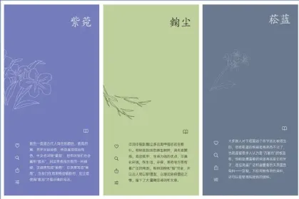 它的每一种色彩都经过了精心的挑选,每一种色彩都出自于中国传统色,每一种颜色都配有对应的植物手绘,支持查看详细的颜色值。