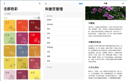 它提供的植物科普内容图文结合,包括:植物学、色彩由来、食物、栽培、应用、文学、故事、花语等。