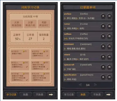 返回软件主界面,点击学习记录按钮,你可以看到自己的词库学习记录,包括正确率、已背诵的单词数量、错误数量、已掌握的单词和未掌握的单词。