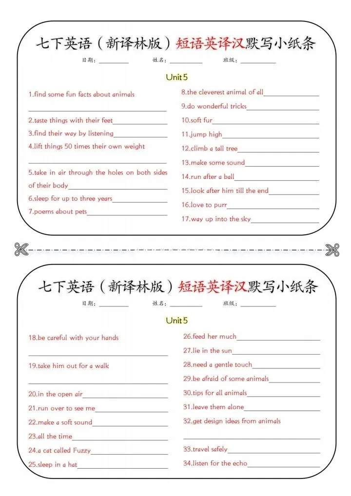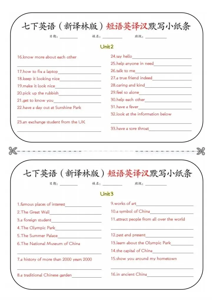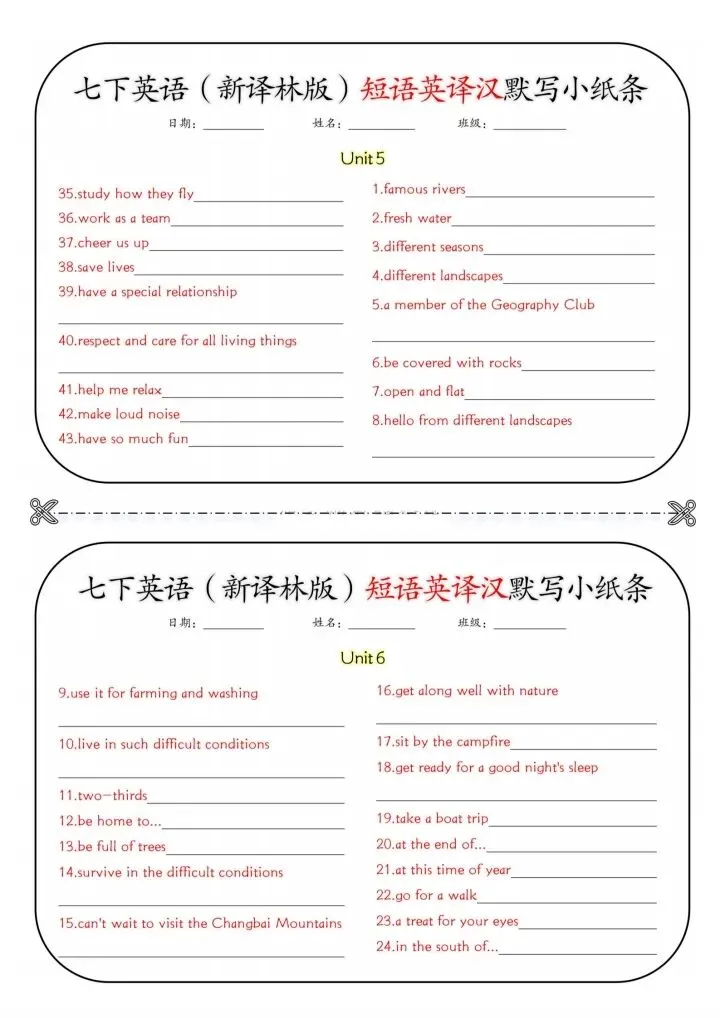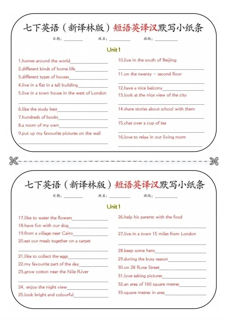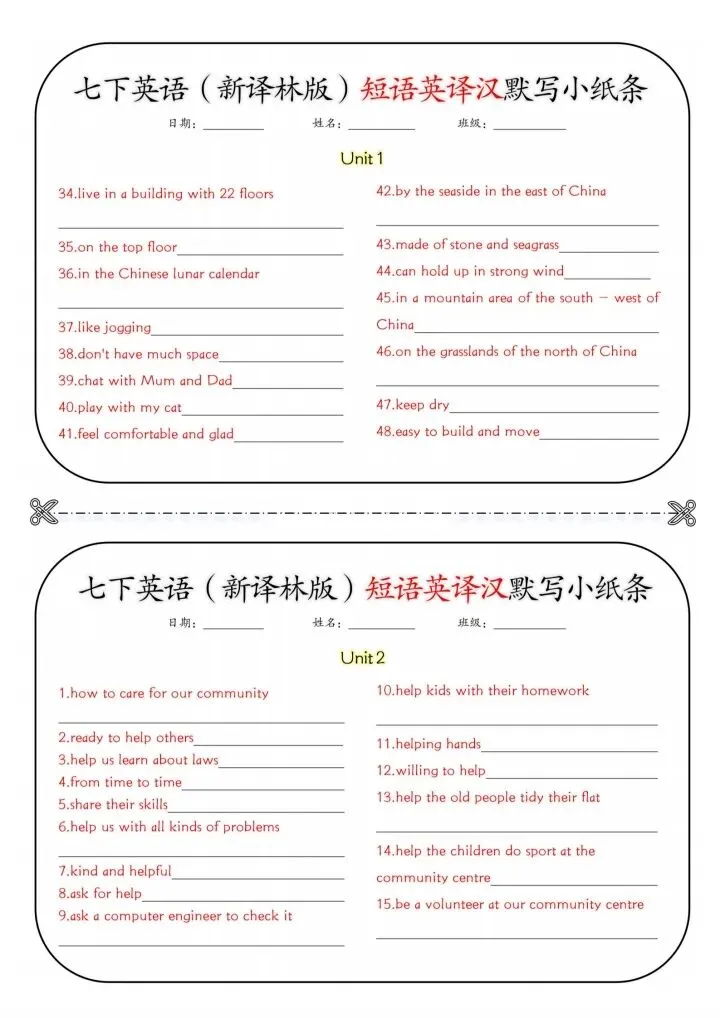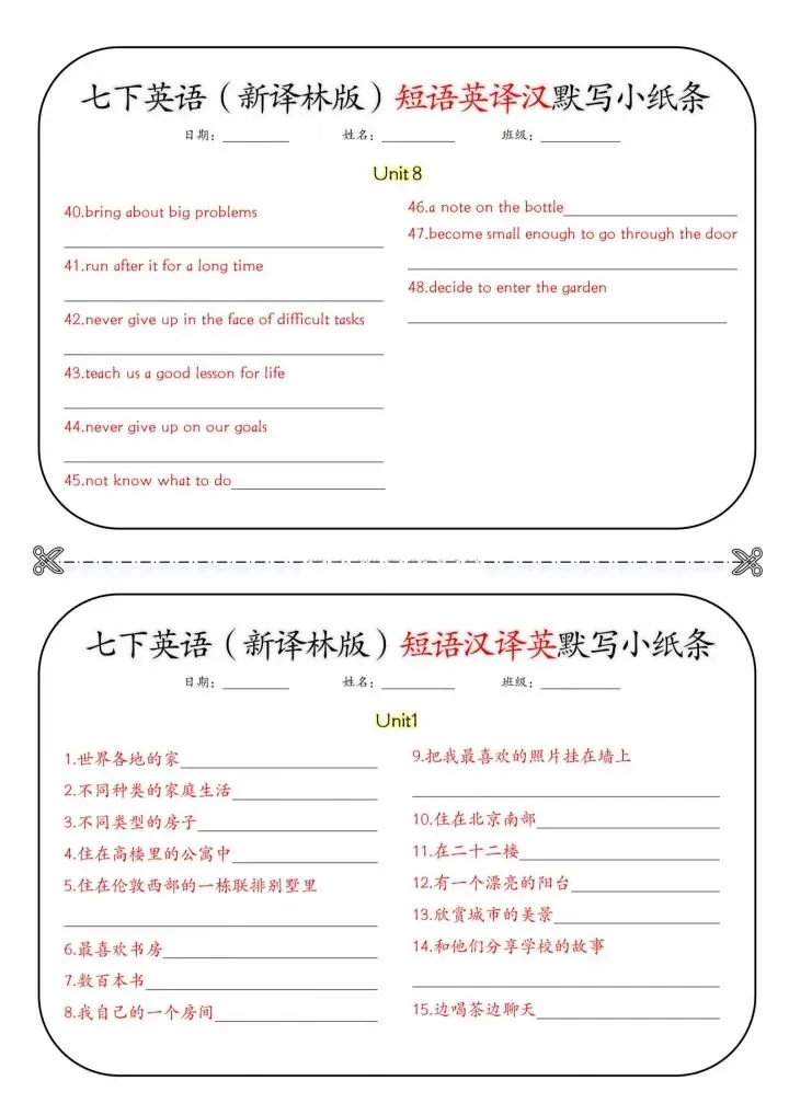 新七下英语(译林版)短语汉译英默写小纸条(完整电子版可打印)