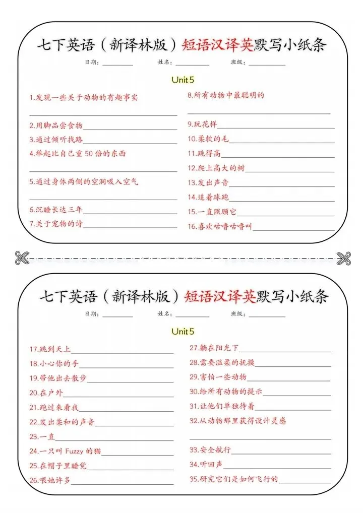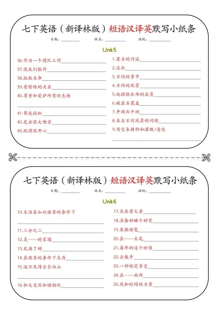 寒假蓄力,进阶不停歇。今日分享新七下英语(译林版)短语汉译英默写小纸条(完整电子版可打印)!高清可打印,每日轻量练习,拒绝无效刷题,用系统化资料筑牢学科基础,让假期成为提升的黄金期,开学轻松领跑。