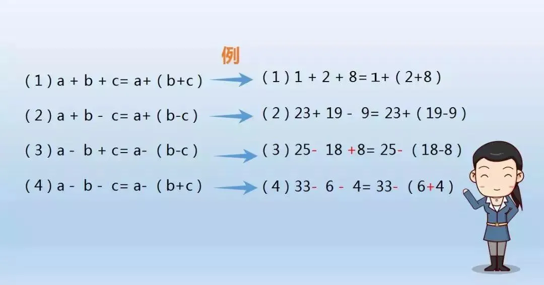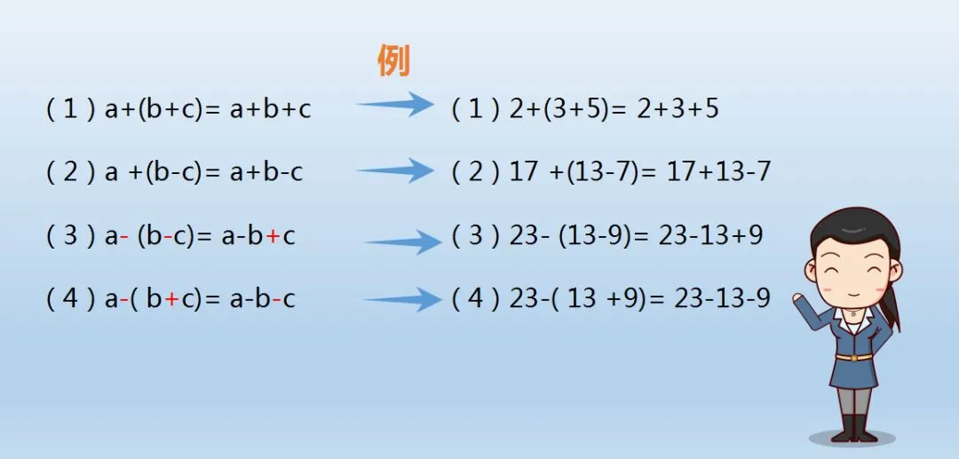 1. 在加减运算中去括号时,括号前是加号,去掉括号不变号,括号前是减号,去掉括号要变号(原来括号里的加,现在要变为减;原来是减,现在就要变为加。)。