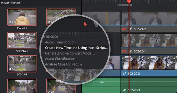 根据用户脚本即可自动的从转录音视频中进行素材匹配,自动剪辑到时间线,并同时将备用镜头画面放置在时间线上以供剪辑师查看对比和操作。