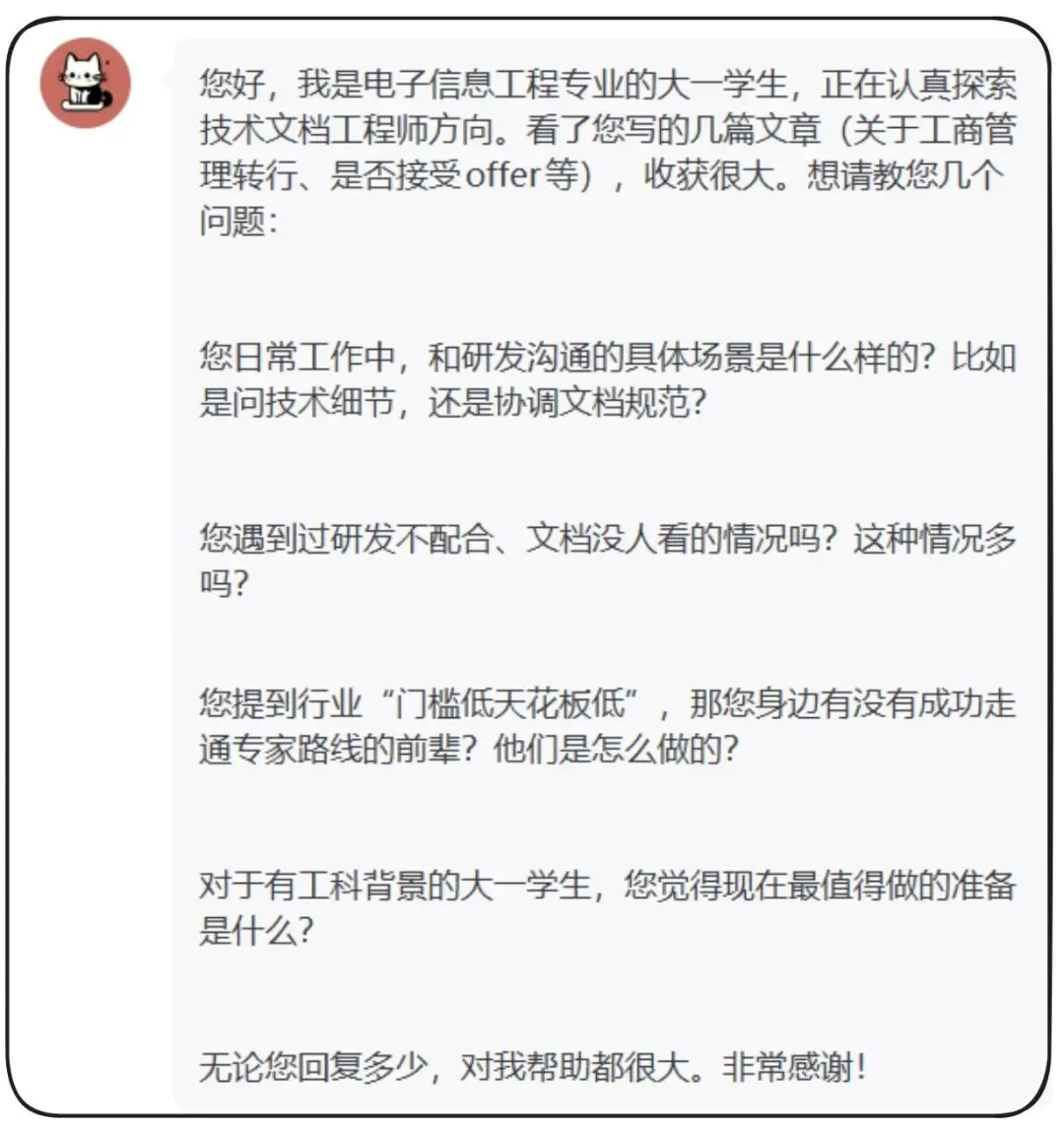 节前收到1位理工科专业大一学生的私信,说自己在“认真探索技术文档工程师方向”,读了我早年写过的几篇文章后,提出了4个问题。